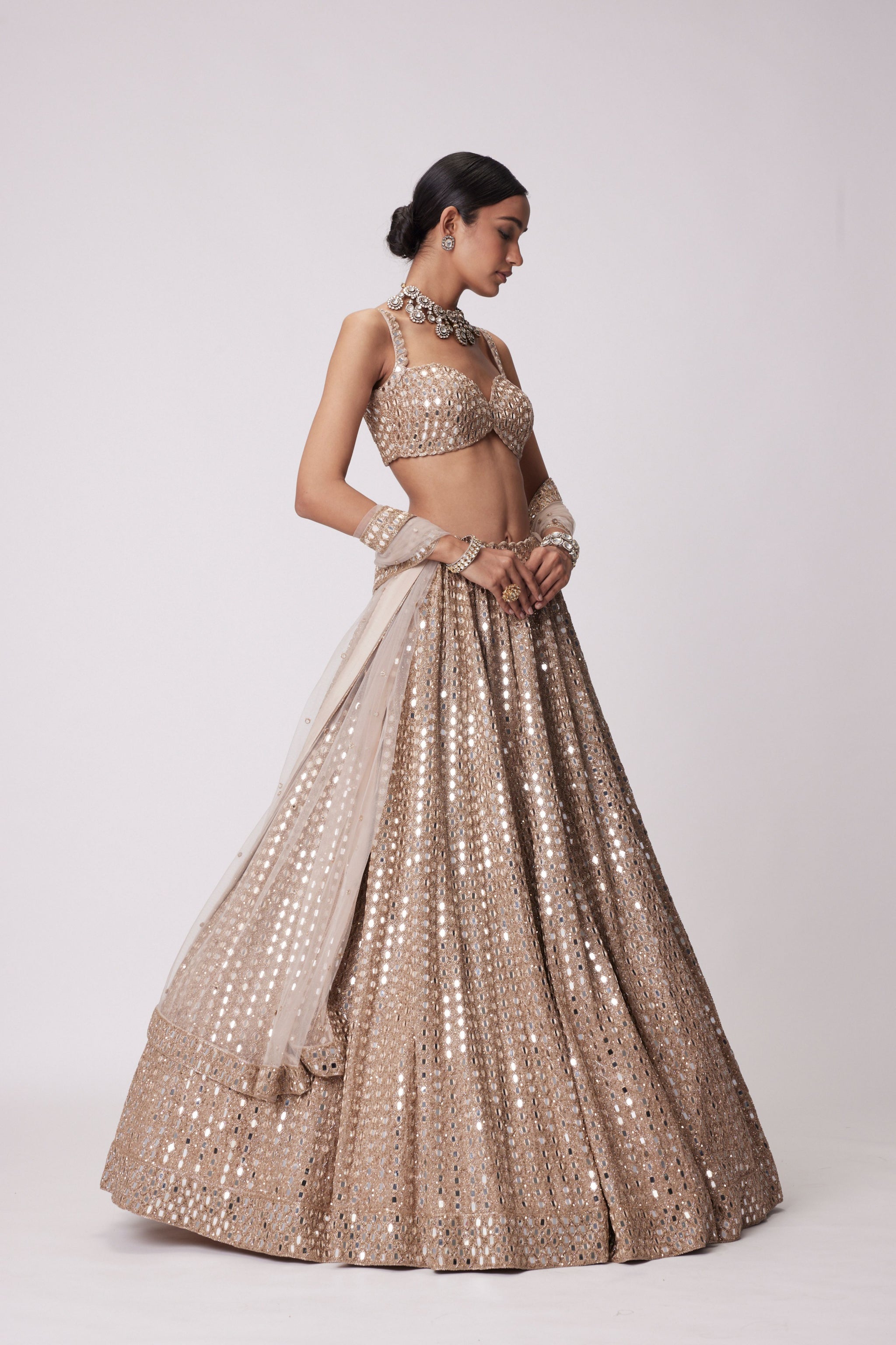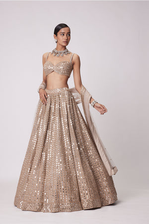 • Light beige hand embroidered lehenga and dupatta with real hand cut mirror embroidered sleeveless blouse.