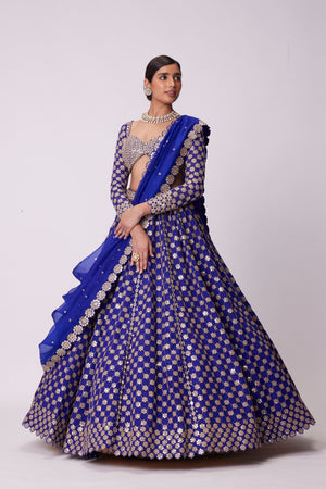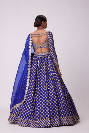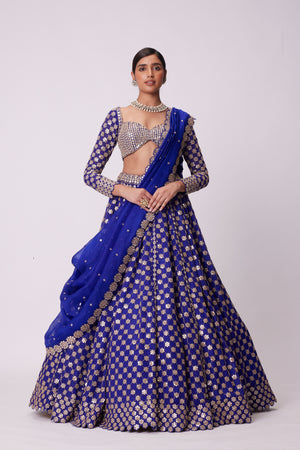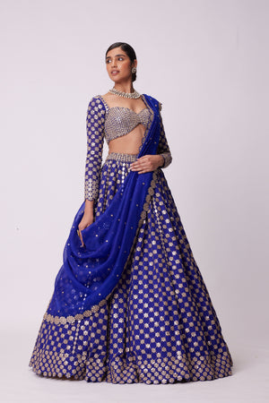 • Persian blue mirror flower embroidered lehenga and dupatta clubbed with real hand cut mirror embroidered fullsleeve blouse.