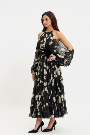 • Chiffon halter neck cold shoulder pouf sleeves midi dress with velvet rose on the waist.