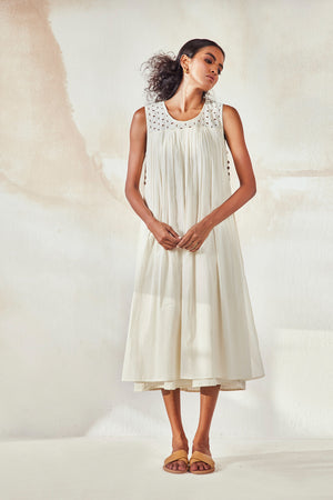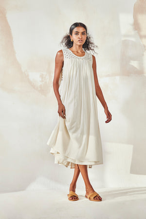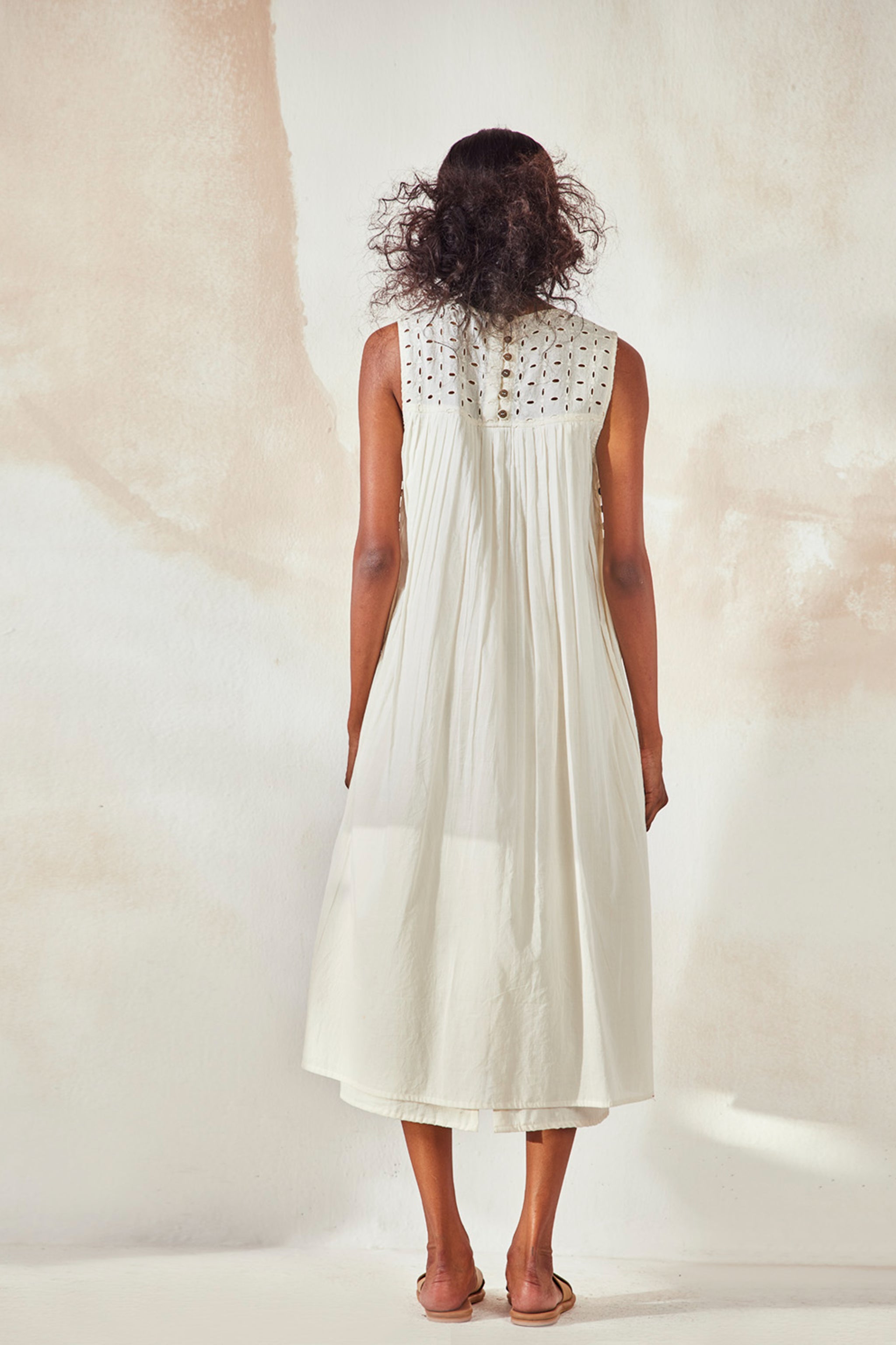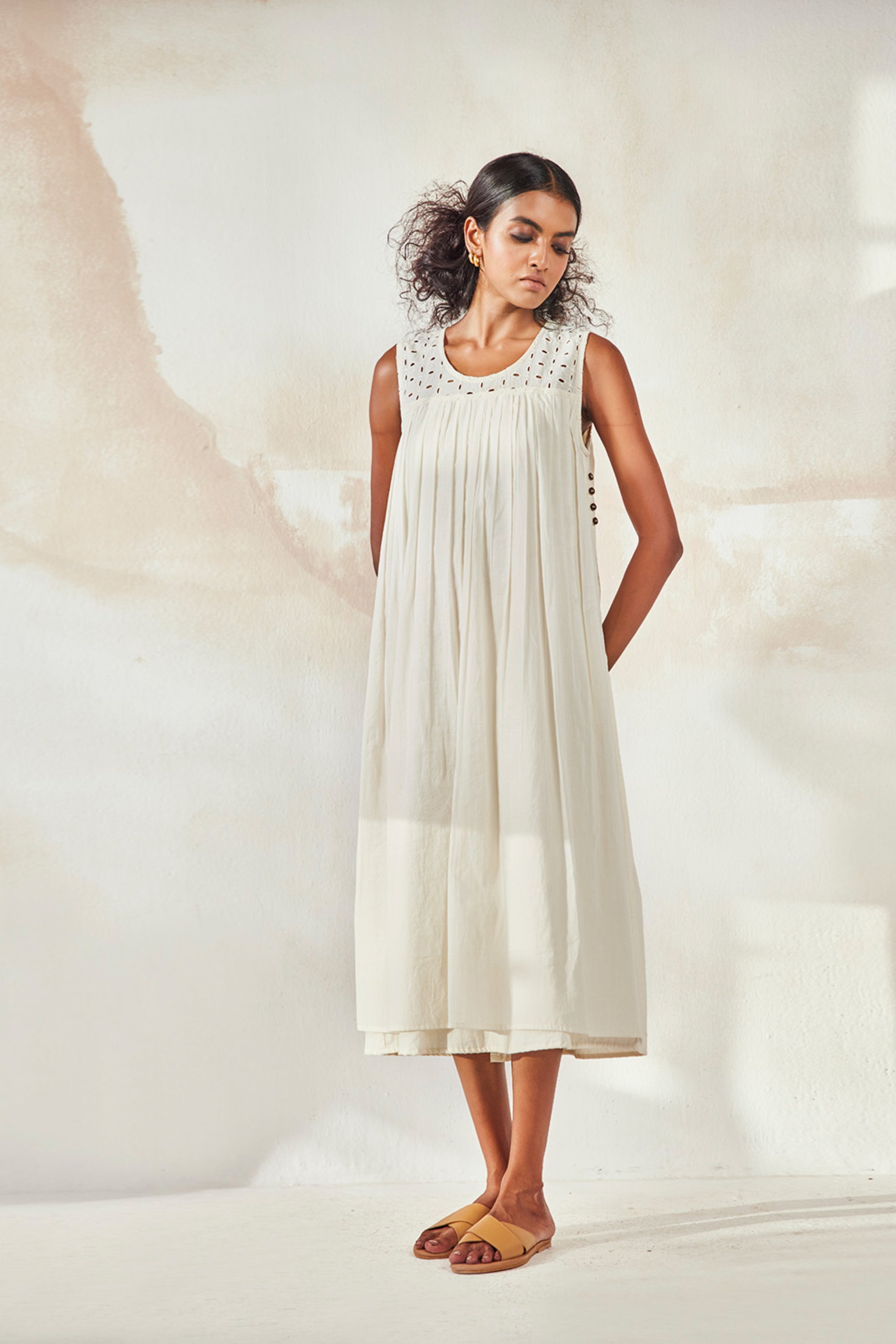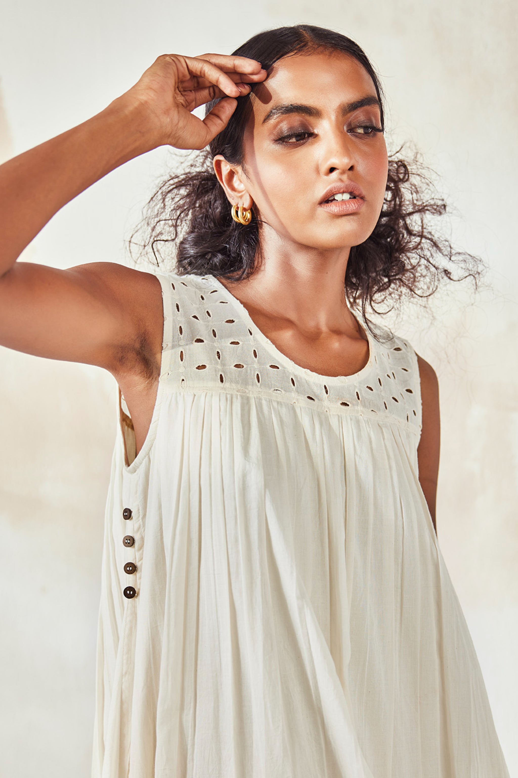 • An ivory white dress with front and back over lay from the bust line and has side button detailing.