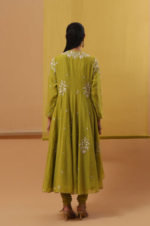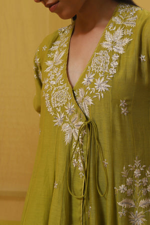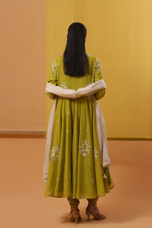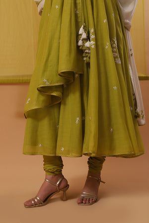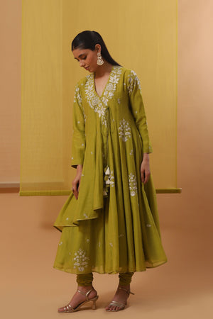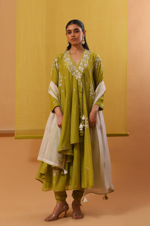 • Step into elegance with our serene green handwoven chanderi mulmul asymmetrical long angrakha. Featuring a deep v-neck and three-quarter sleeves, it harmonizes perfectly with a pure lycra crepe churidhar. Adorned with gara embroidery in off-white silk threads and silver sequins, this ensemble is completed with an off-white and beige ombre pure flat chiffon dupatta, highlighted with green silk thread motifs, it adds a touch of sophistication with silver sequin accents.