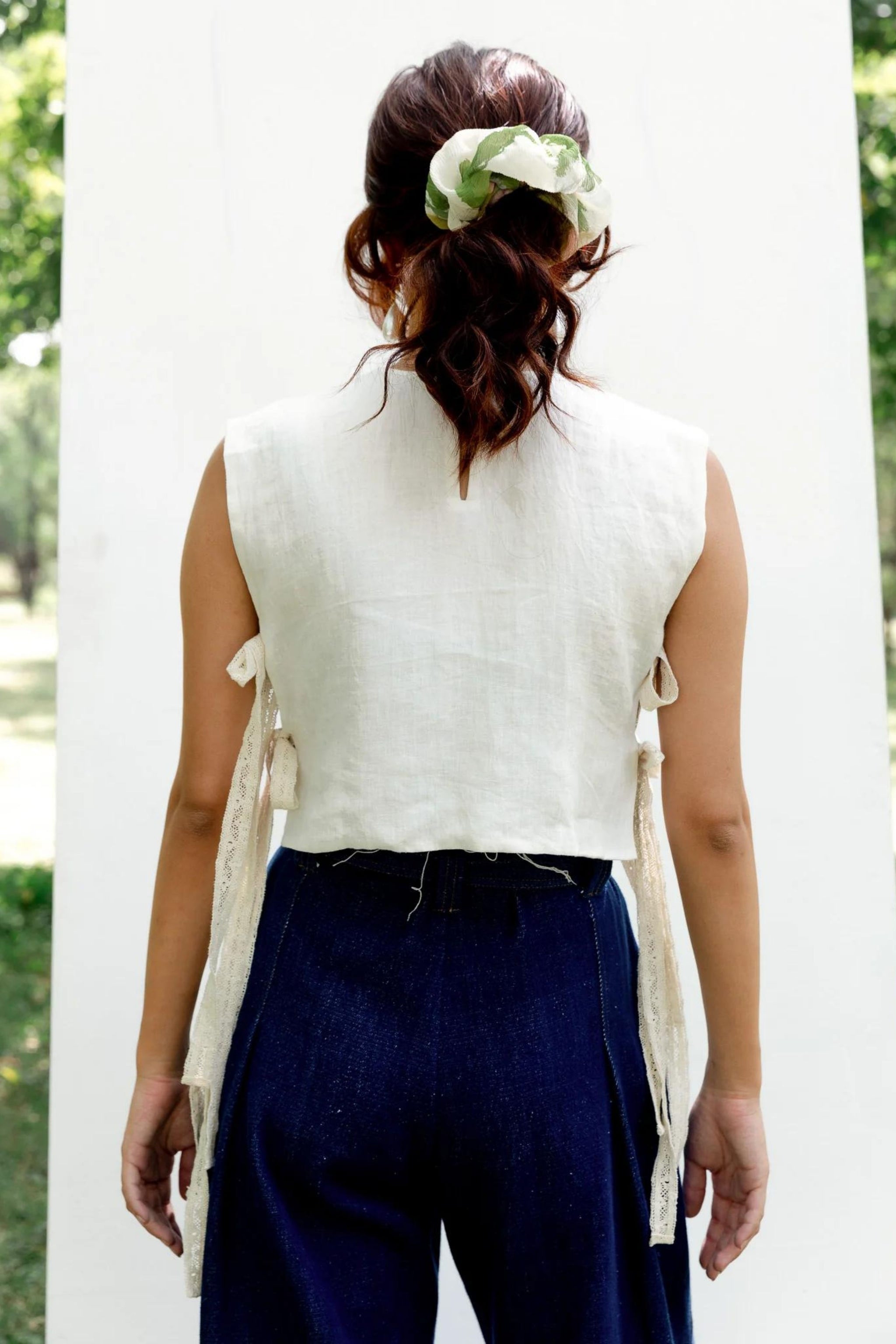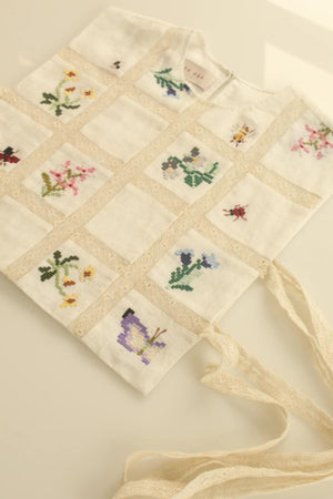 • Hand-embroidered bib with lace inserts. It is made using the aari embroidery technique featuring a side bead closure with lace. Hand-embroidered over 65 hours using aari embroidery. The bralette has been used only for styling purposes. It is 16 inches in length for small size