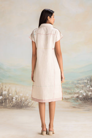 • A linen round roll-collared dress with extended sleeves and unique overlocked seam lines in contrast colors, adding perfect design detail to the garment.
