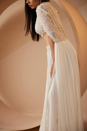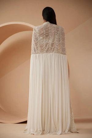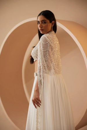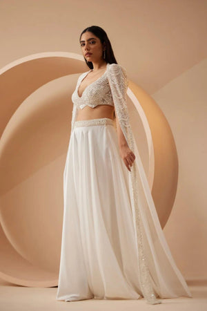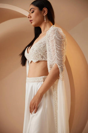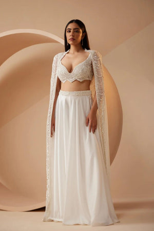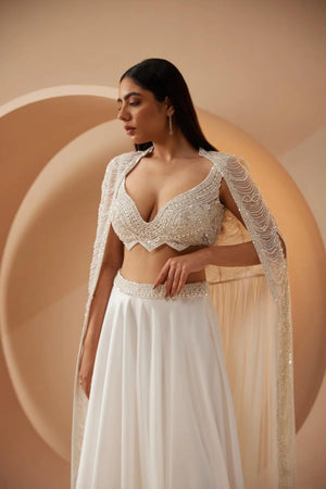 • Our pearl white cape set is the perfect fusion of grace and glamour! The hand-embroidered cape complements the luxe design beautifully, while the blouse features dazzling crystal stone work, cutdana pipes and hand-sewn sequins. Taking the look to a whole new level with the skirt having extreme flare. The skirt displays an intricate hand embroidered belt that accentuates the whole outfit.