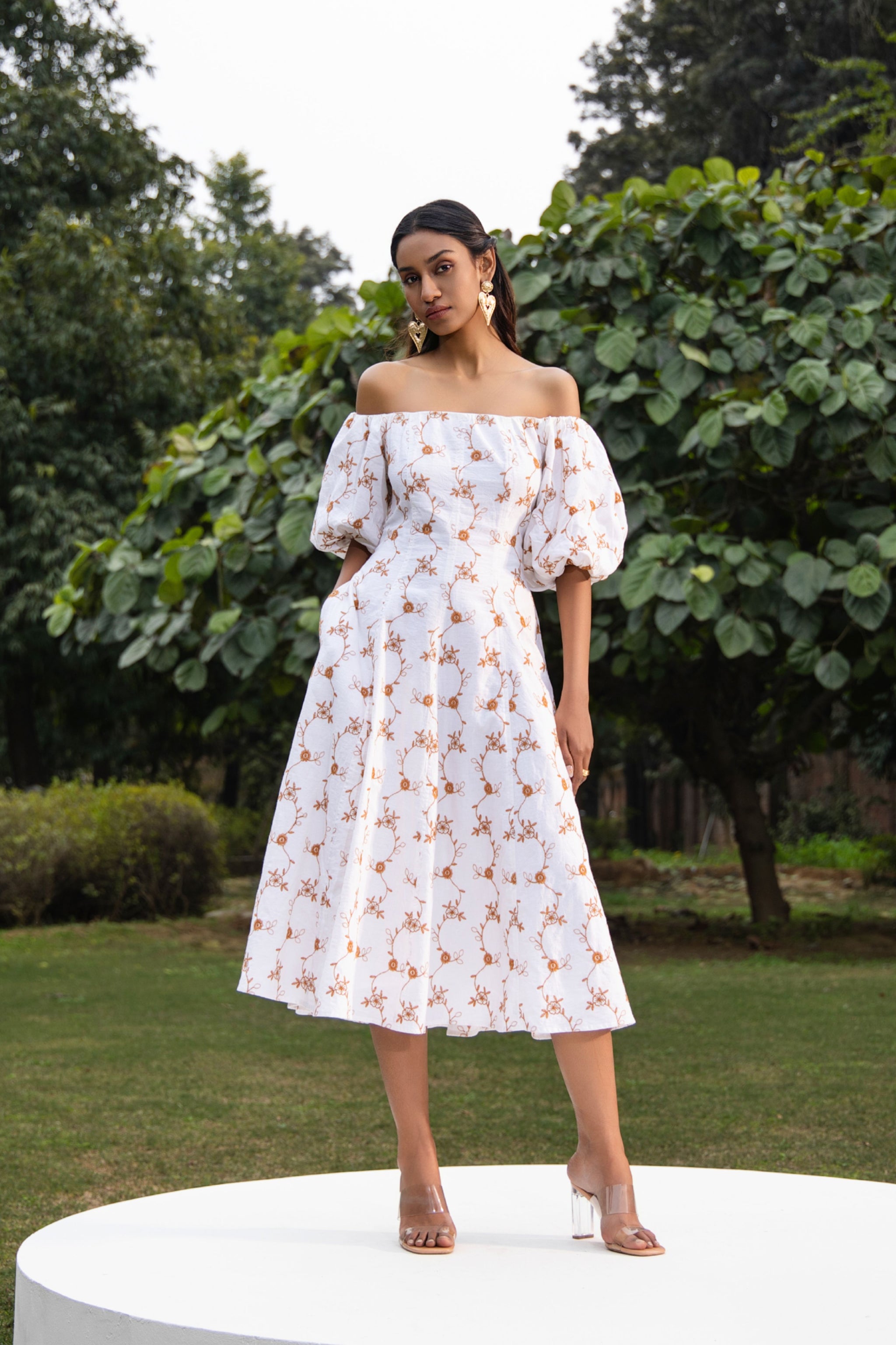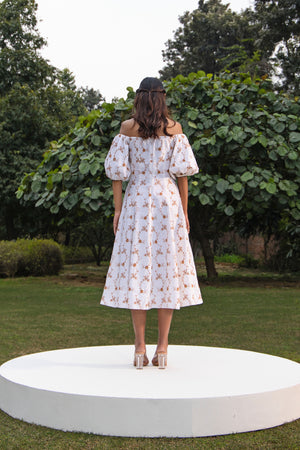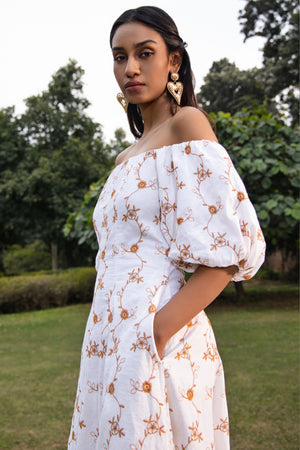 • The serenity dress is an off shoulder dress features a schiffli embroidery design all over the body and sleeves with panel detailing on body, enhancing its classic charm. It's crafted from cotton-linen blend and slighlty fitted at waist to gives an hour glass shape to the body.