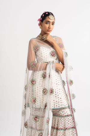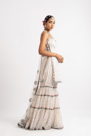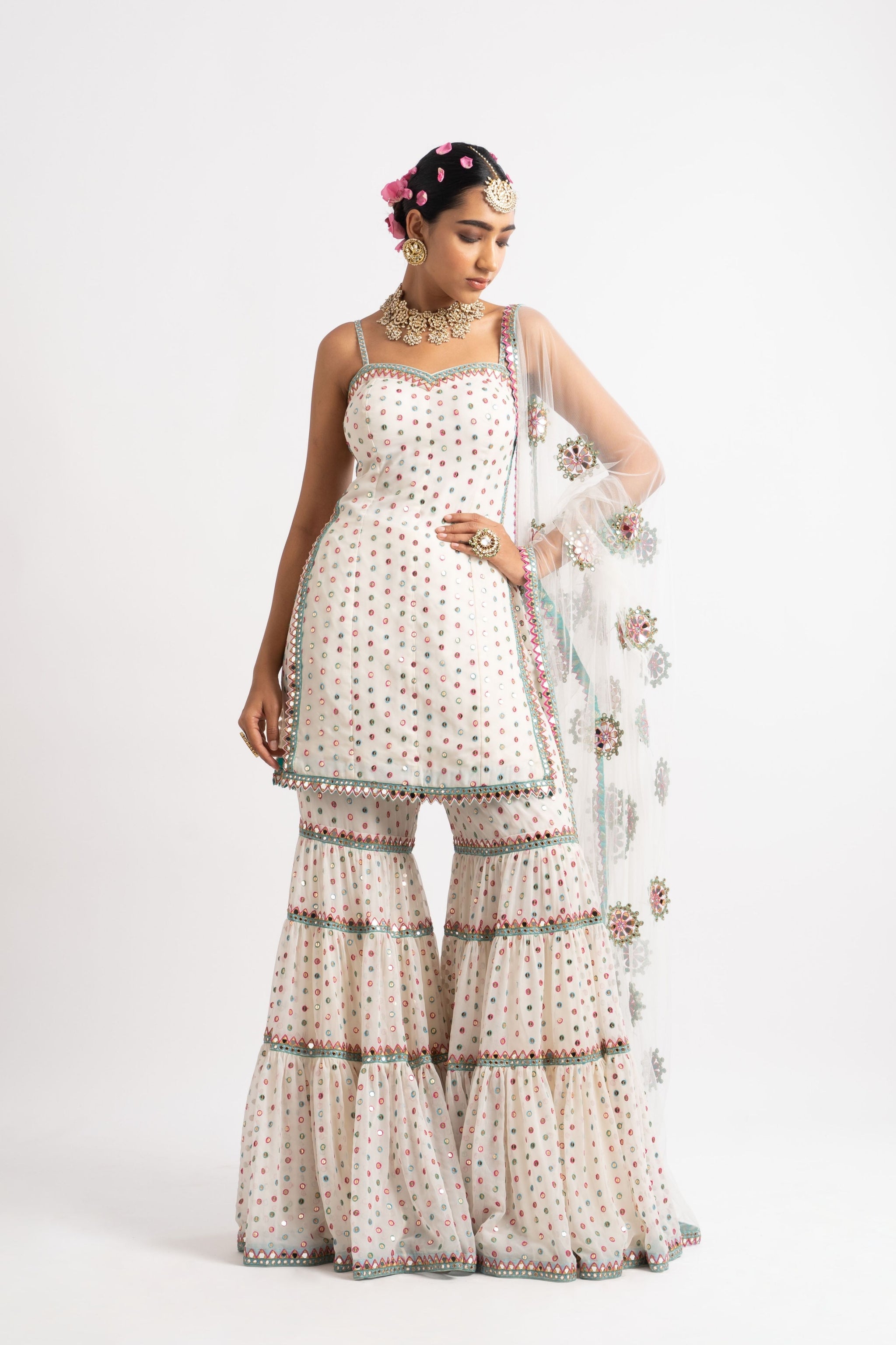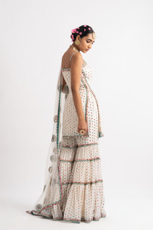 • Polka sequins multi color hand embroidered multi tier sharara and kurta with multi mirror work dupatta.