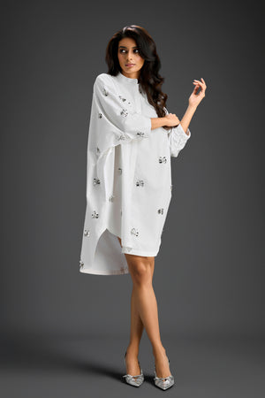 • White oversized cotton shirt dress, detailed with hand-embellished butterfly motifs and soft pleated sleeves