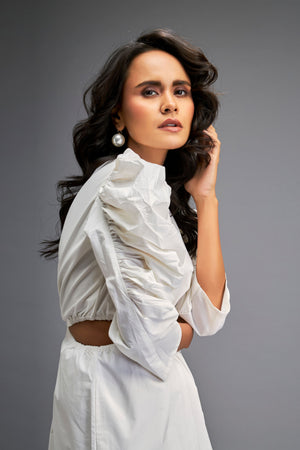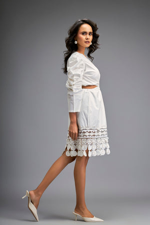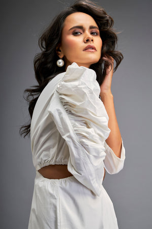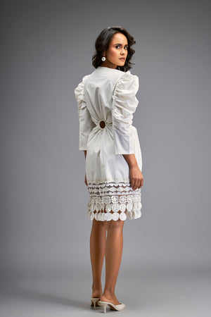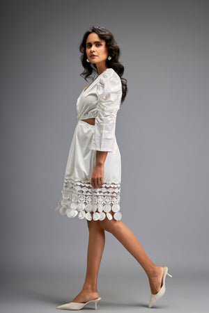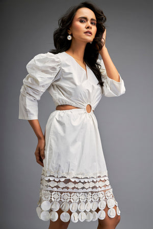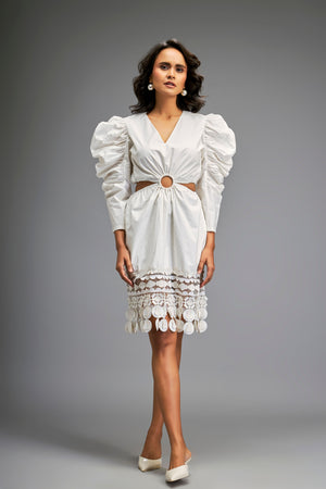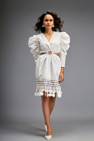 • Structured dress with bold puff sleeves, cut-out waist and detailed applique hemline.
