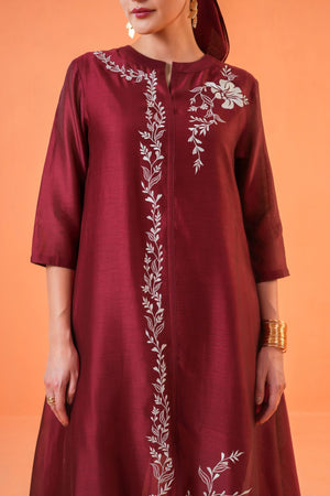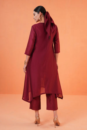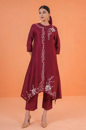 • Maroon asymmetrical chanderi silk kurta set with intricate resham thread embroidery, styled with coordinated pants for graceful versatility
