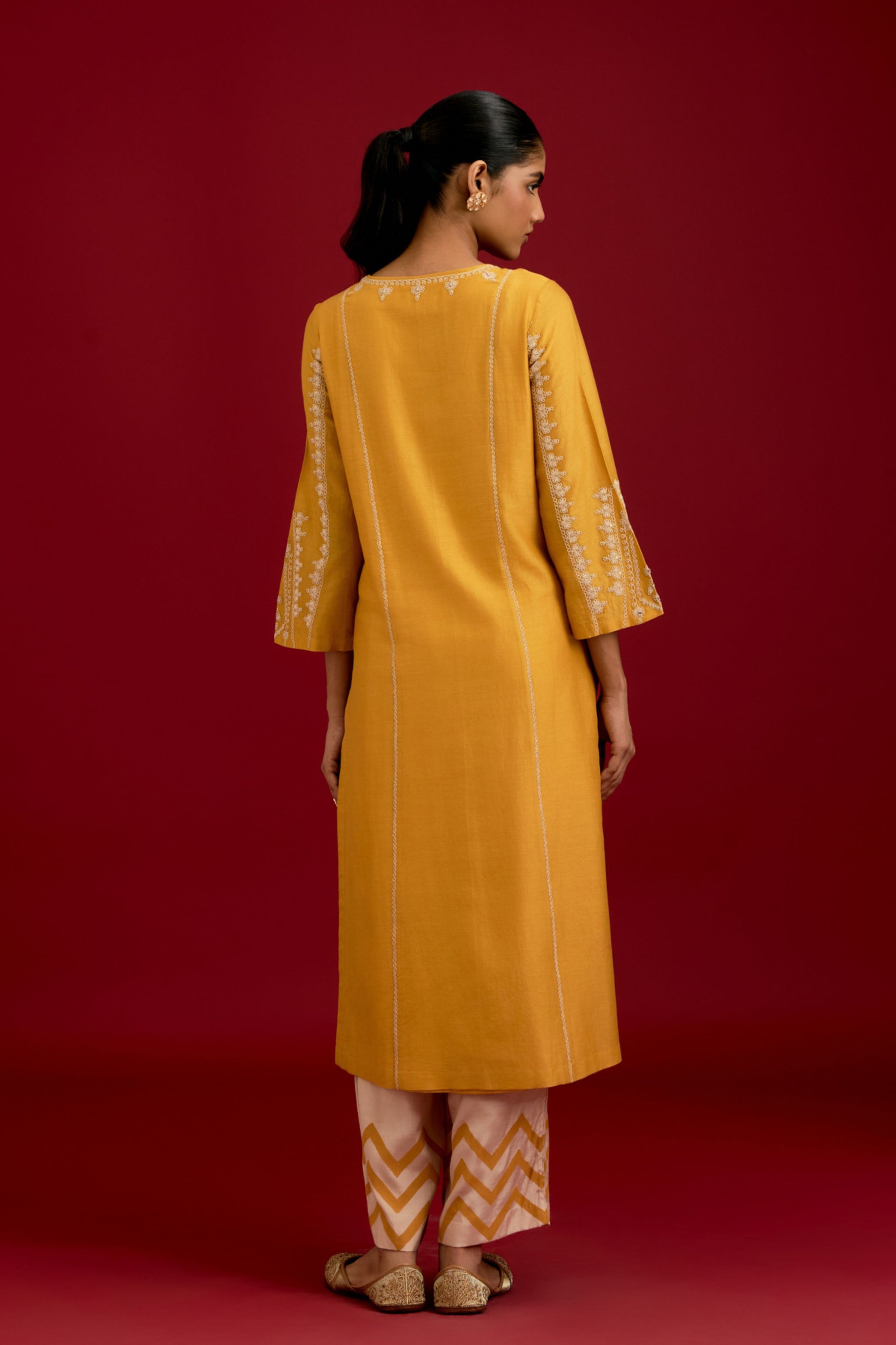 • Vibrant mustard silk chanderi set, featuring dori embroidery, sequins, and mirror work. Palazzo has a unique hand block print, complemented by a dupatta with dori embroidery.