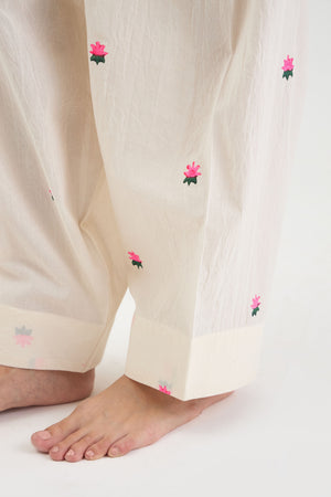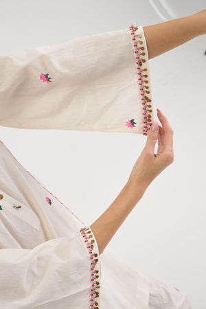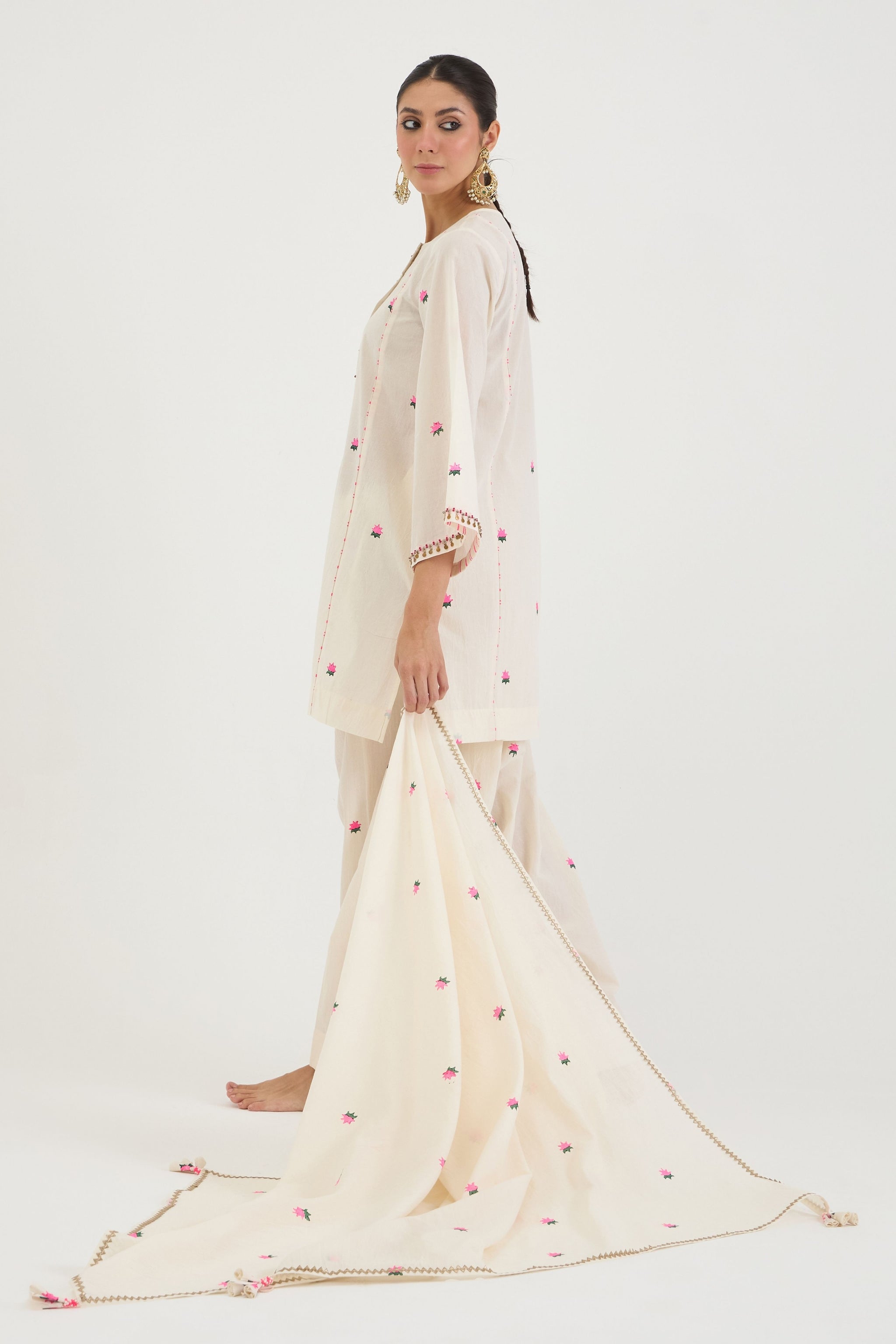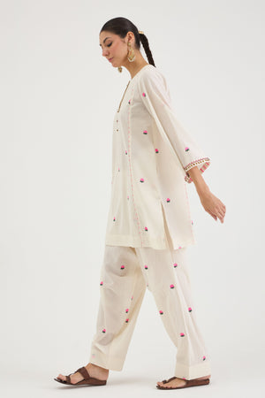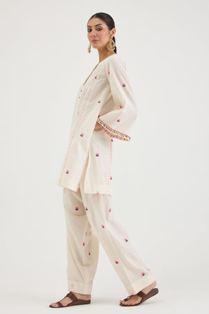 • Kalidar short kurta embellished with gota on the kali, intricate hand embroidery paired up with printed farsi pant.