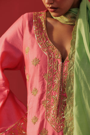 • Pink in golden embroidery kurta with khada pyjama and dupatta.