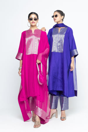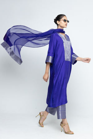 • Ultramarine pure silk kurta with woven benarasi details at front and back yoke and sleeves with matching pants with brocade detail at the hem paired with organza dupatta with brocade details.