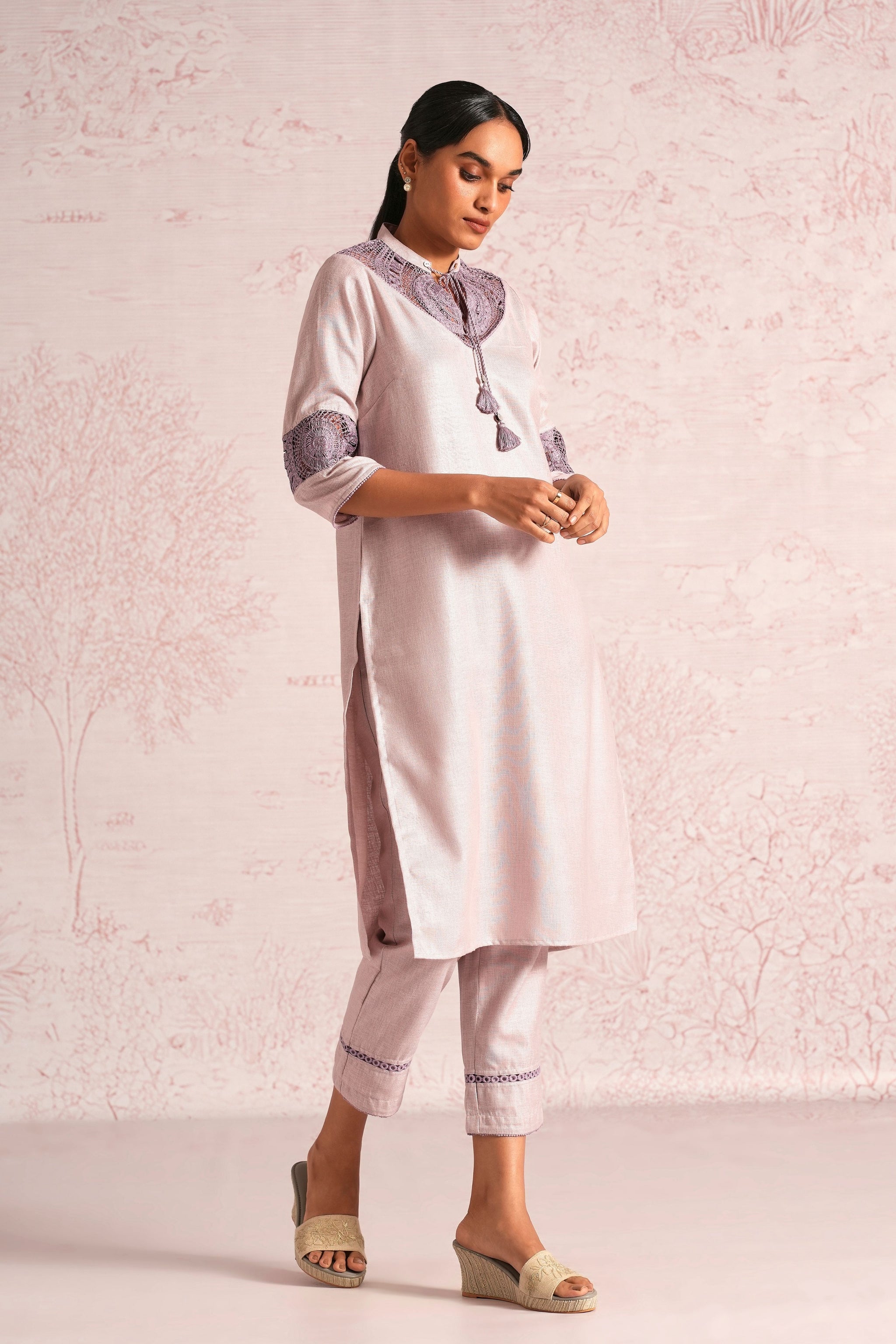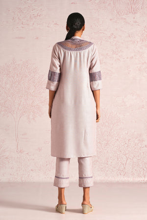 • This straight-cut kurta features a relaxed silhouette with 3/4 sleeves, finished with a soft round neckline and tie-up tassel detailing. Crafted with intricately developed in-house embroidery panels at the front yoke and sleeve bands, enriching the silhouette with layered texture and refined craftsmanship. Paired with straight pants featuring lace inserts at the hem, completing the ensemble with subtle textural contrast. Ideal for elevated daywear and refined everyday dressing. It brings together comfort and sophistication, a modern expression of artisanal craft and timeless celebration. Kurta length 42” / pant length 36”/ model height 5'8"