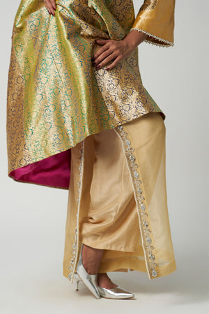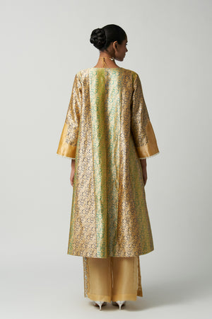 • Exuding timeless elegance, this hand-woven brocade kurta is crafted in an a-line silhouette that flatters every body type. Designed with thoughtfully placed panels for a graceful fall and fluid movement, the kurta embodies both structure and ease. Its neckline, shaped in the form of mughal arches, adds a regal touch, making it a versatile piece for both modern and traditional occasions.
