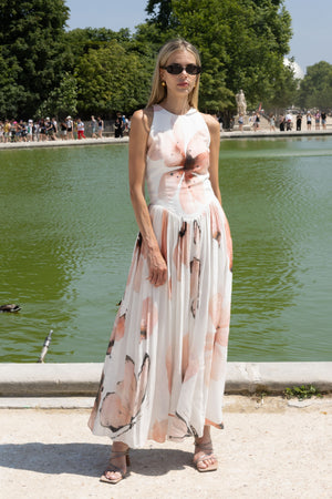 • This statement midi dress features a sculpted corset-style bodice that contours the silhouette, offering a flattering and structured fit. The halter neckline highlights the shoulders, while the pleated skirt adds dimension and movement. Adorned with bold, oversized floral motifs in soft blush and charcoal tones, this piece brings together artful printwork with a refined shape,ideal for daytime events or destination soirées.