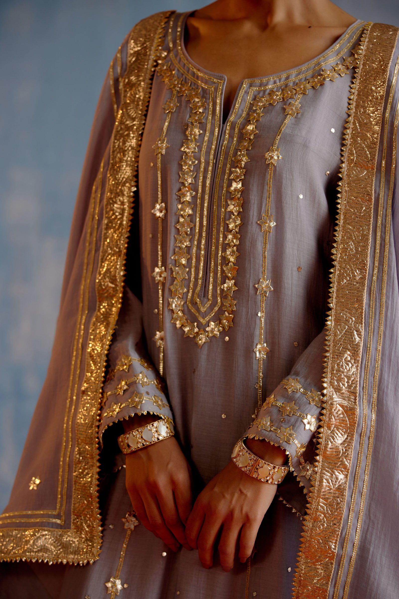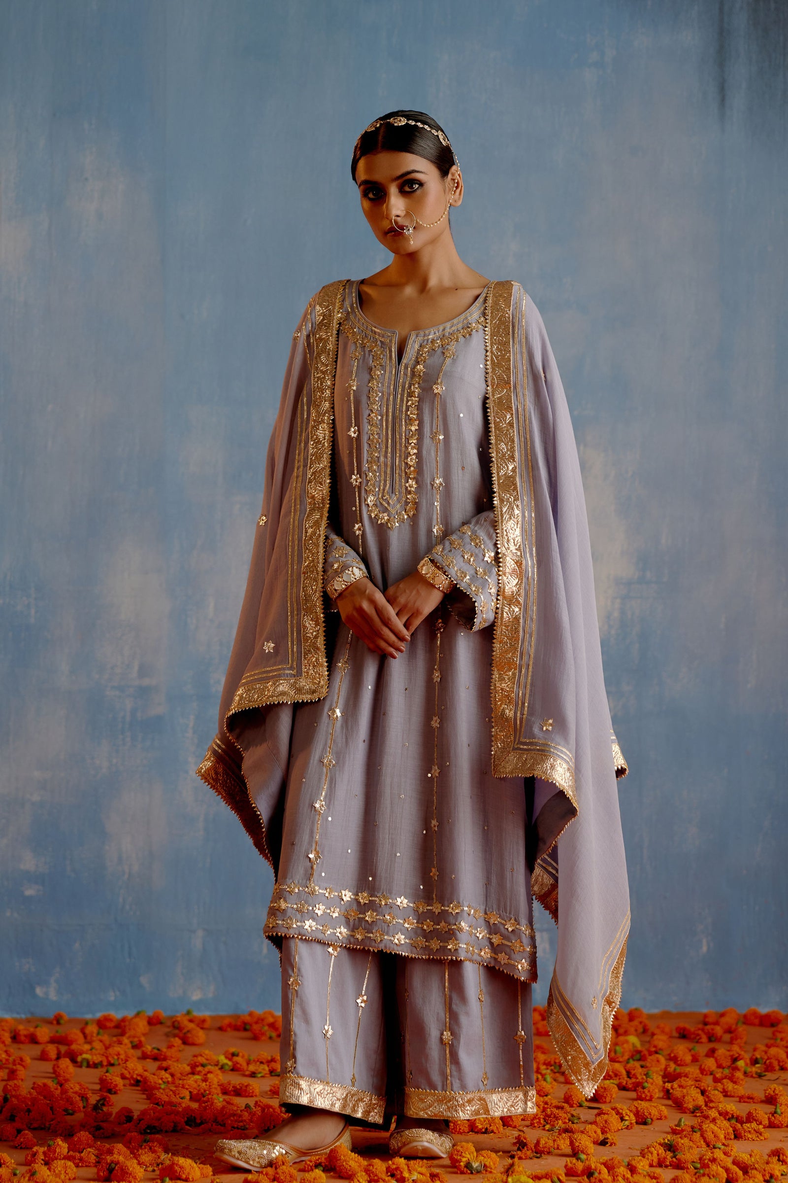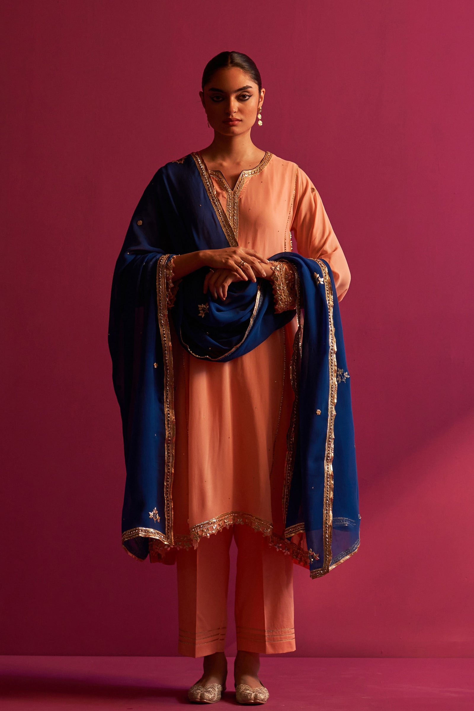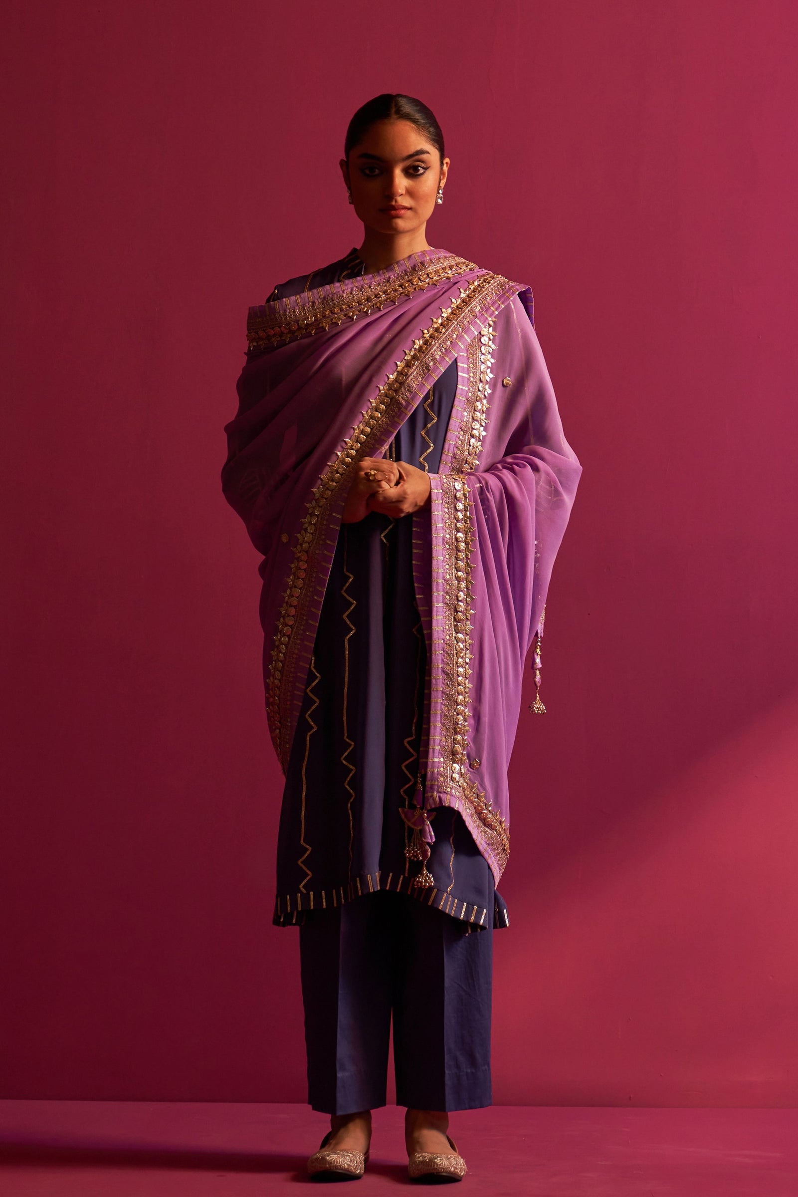 • With the time that passes her charm fluoresces. Brown-earthy, warm a natural allure kurta on georgette and dupatta on contrasting colour paired with straight pants. Gota, beads and dhanak hand embroidery in dull gold