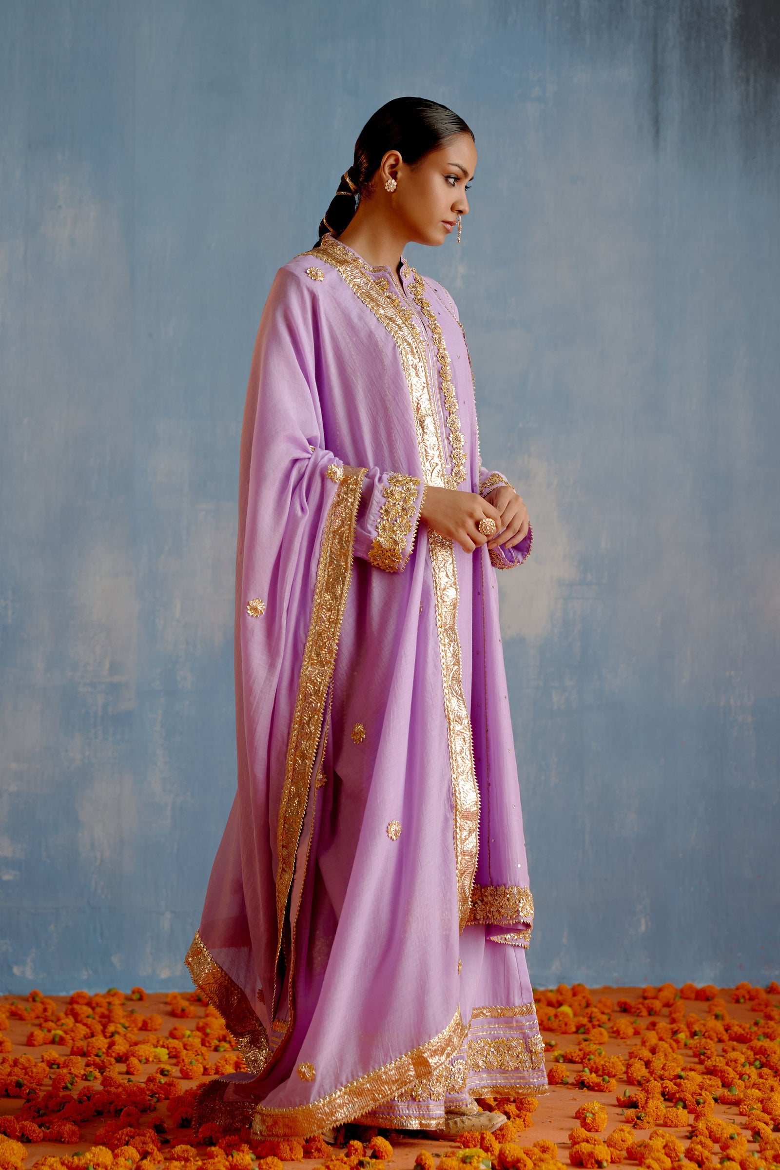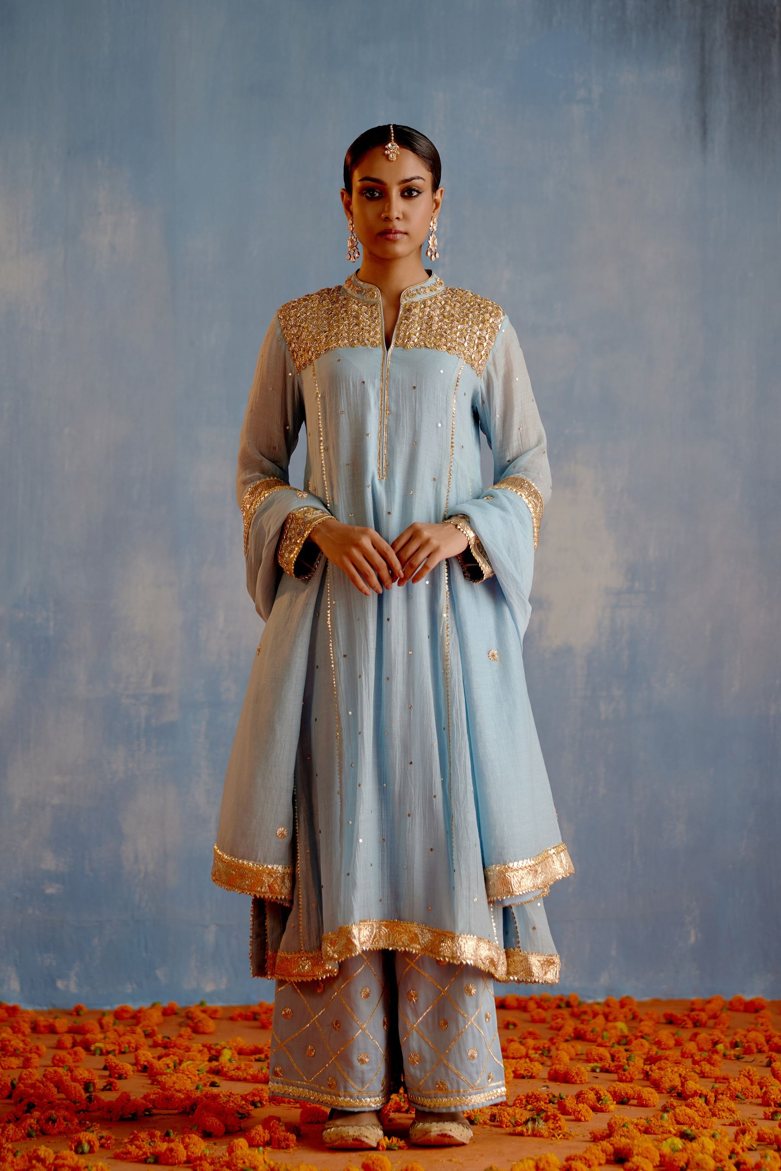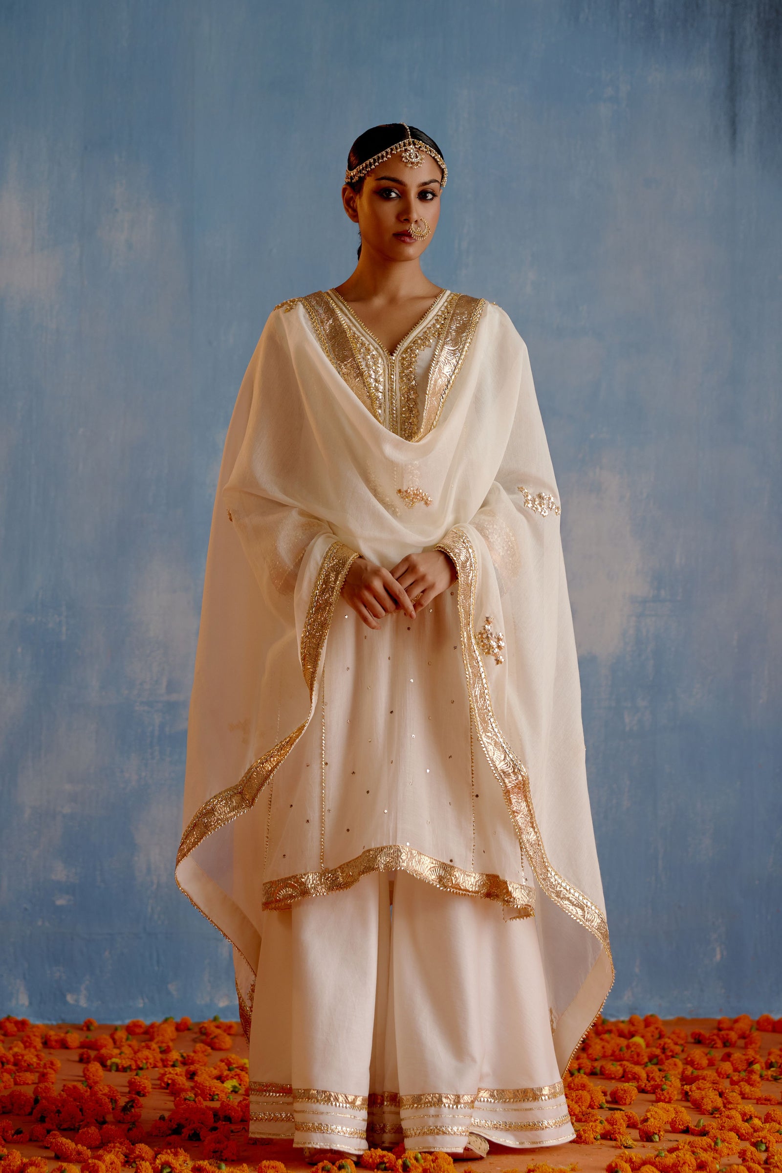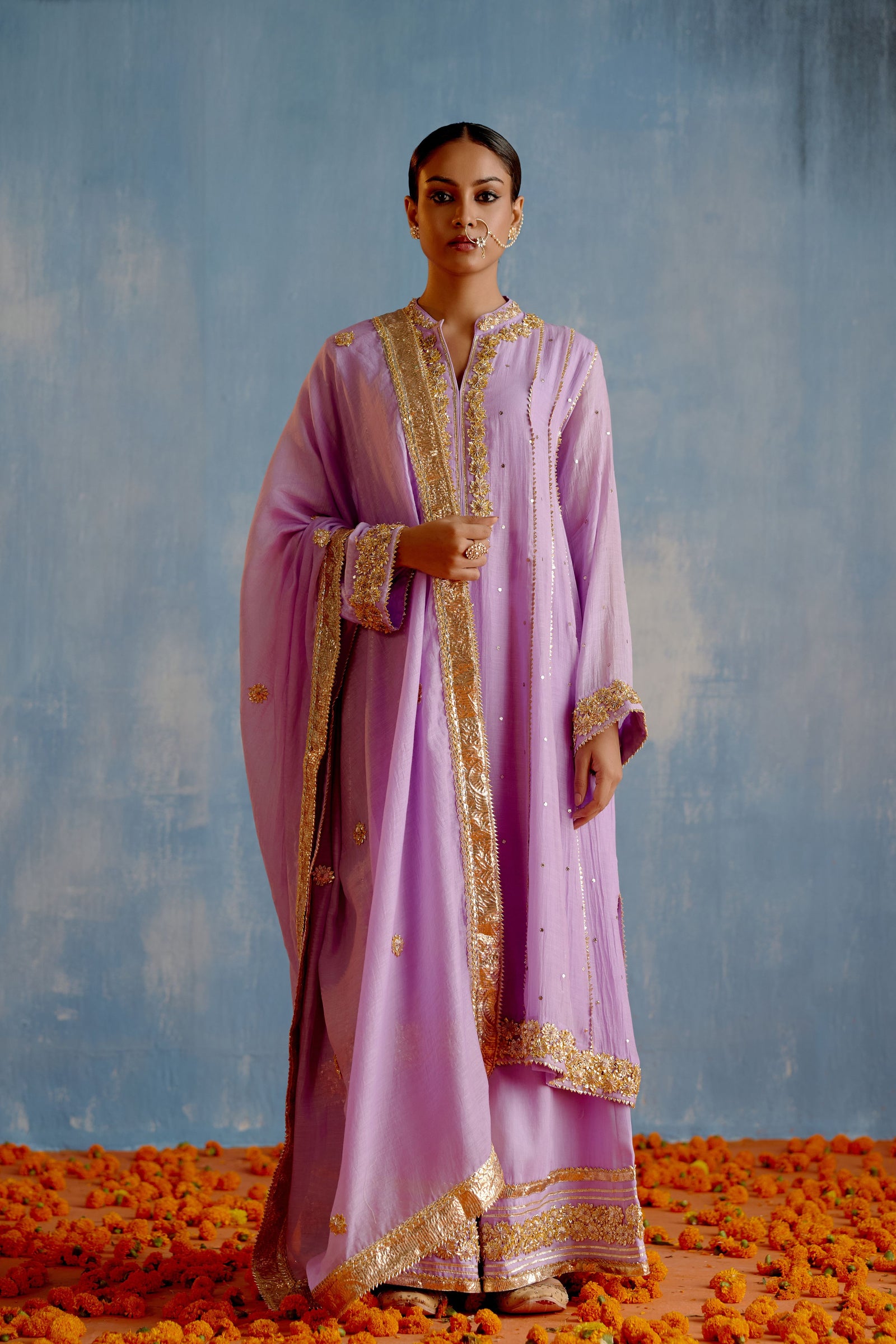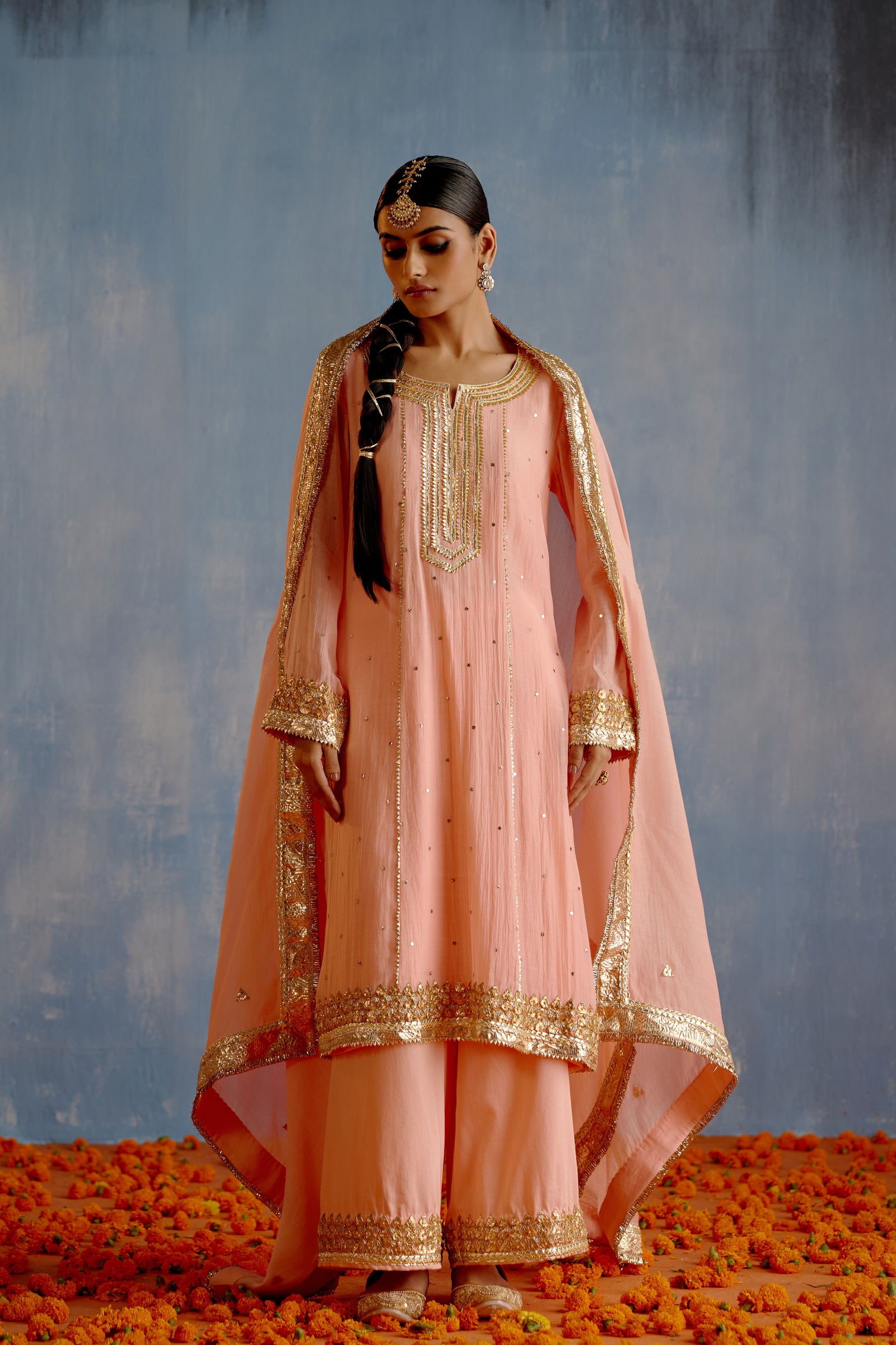 • With the time that passes her charm fluoresces. Brown-earthy, warm a natural allure kurta on georgette and dupatta on contrasting colour paired with straight pants. Gota, beads and dhanak hand embroidery in dull gold