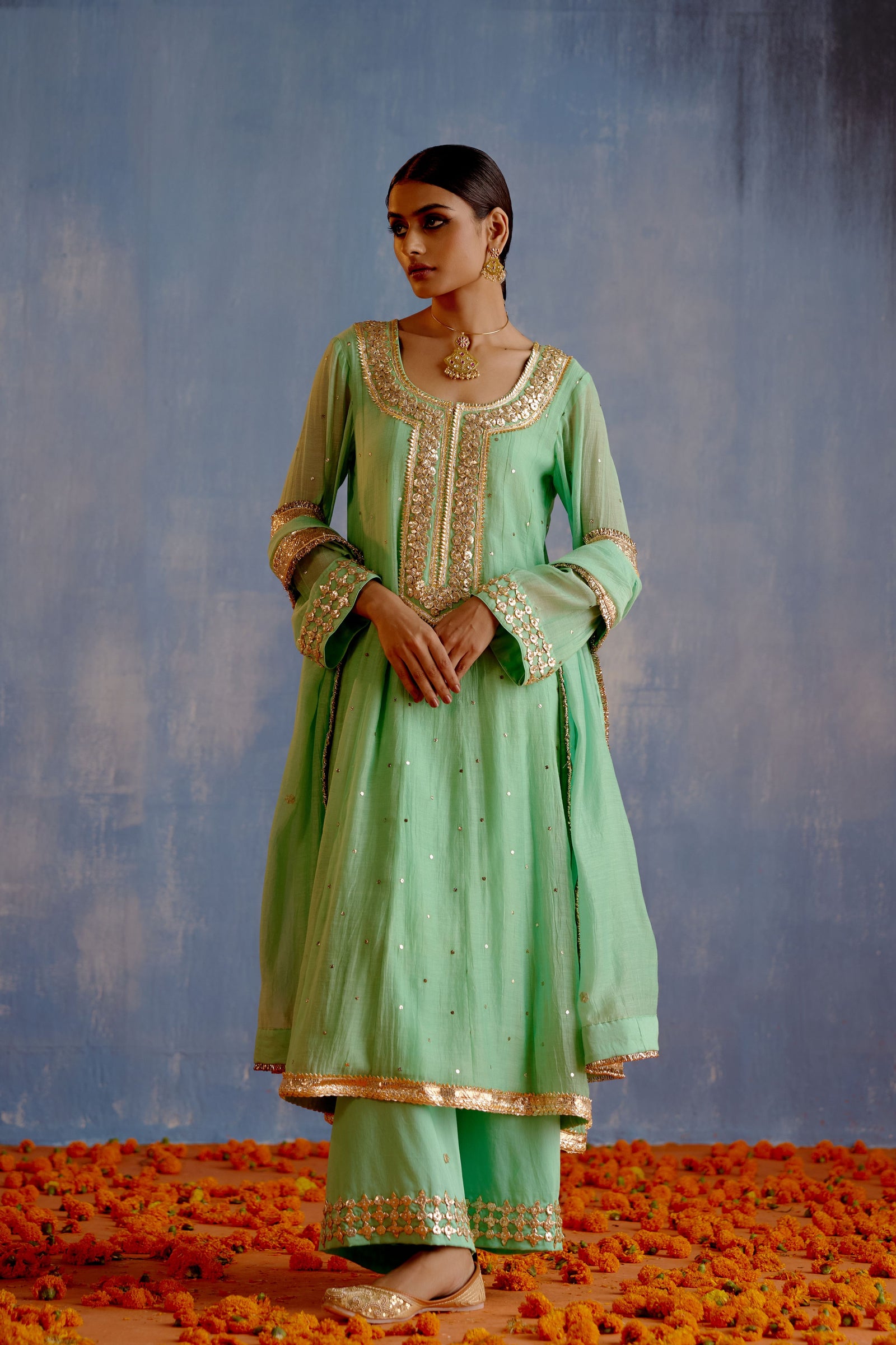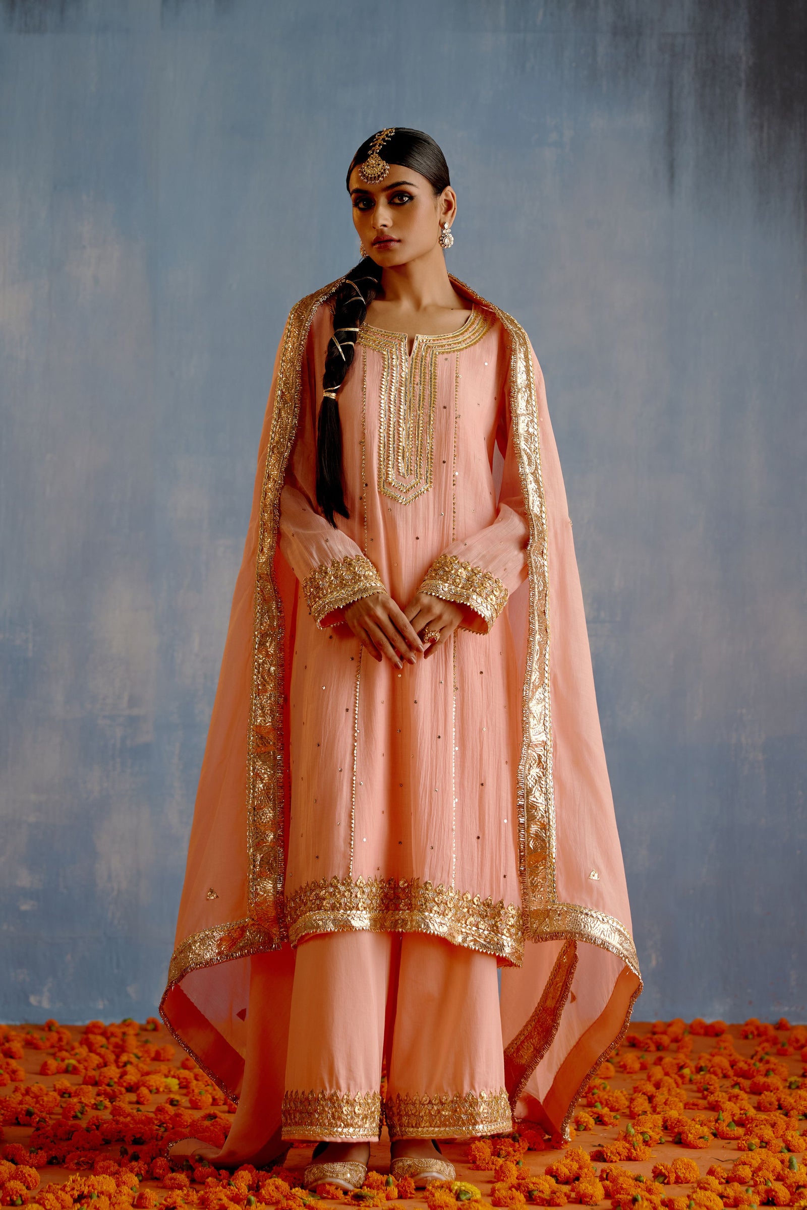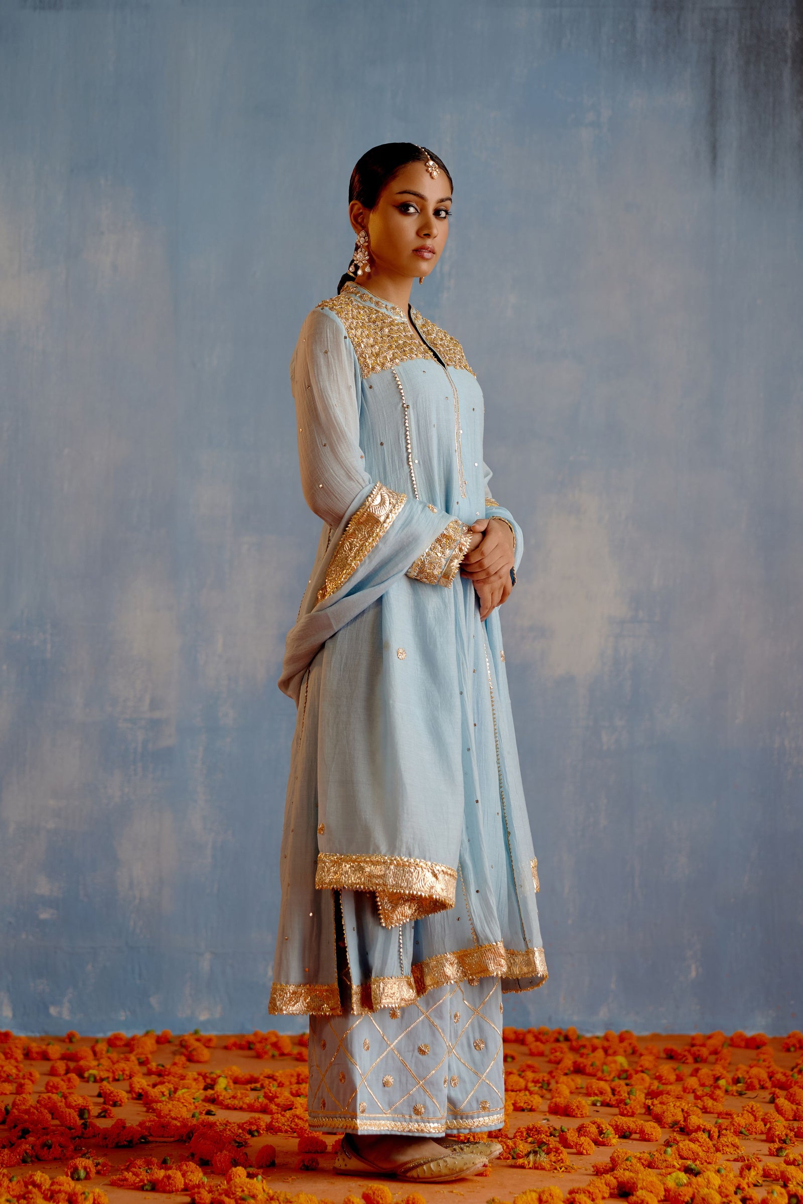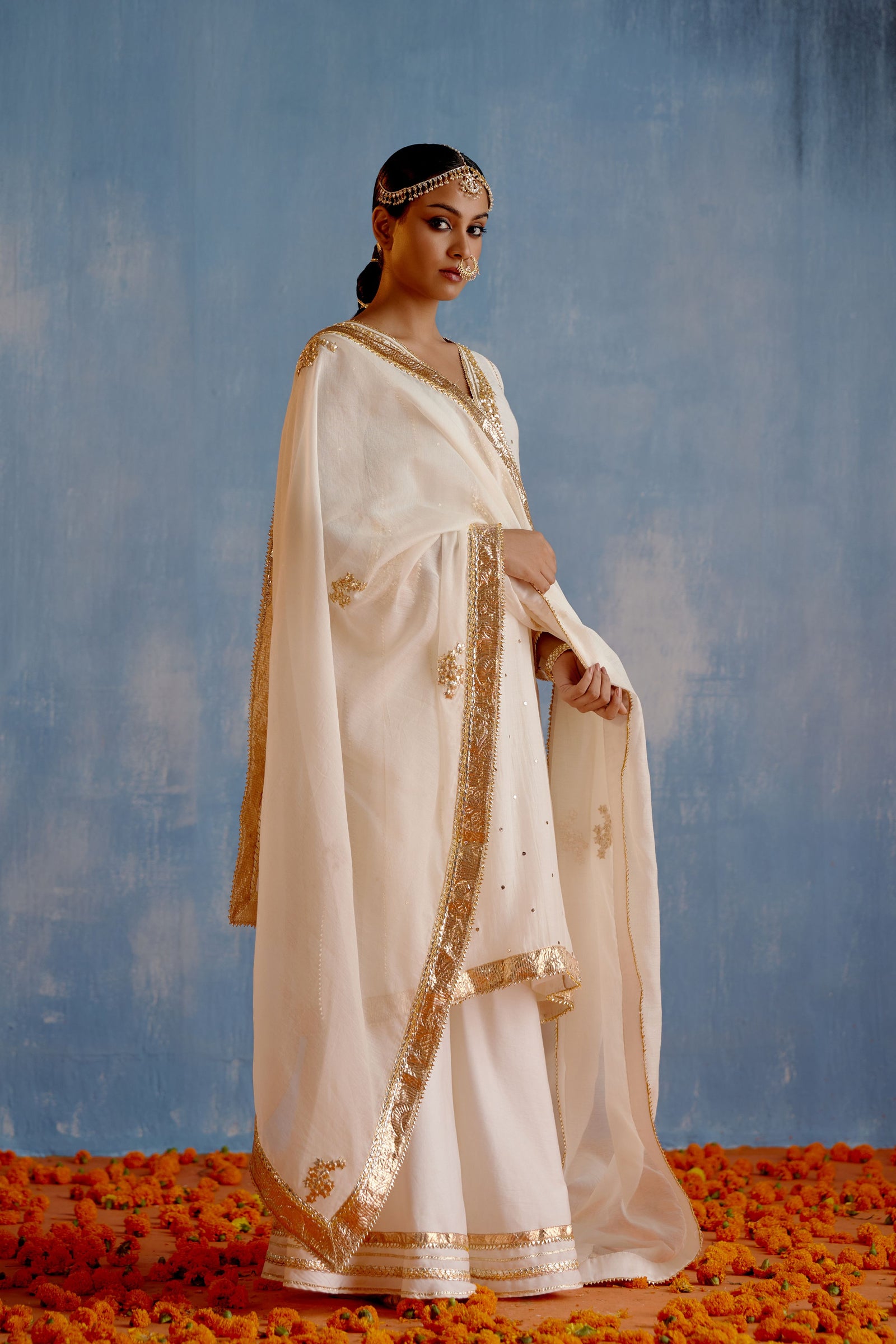 • With the time that passes her charm fluoresces. Brown-earthy, warm a natural allure kurta on georgette and dupatta on contrasting colour paired with straight pants. Gota, beads and dhanak hand embroidery in dull gold