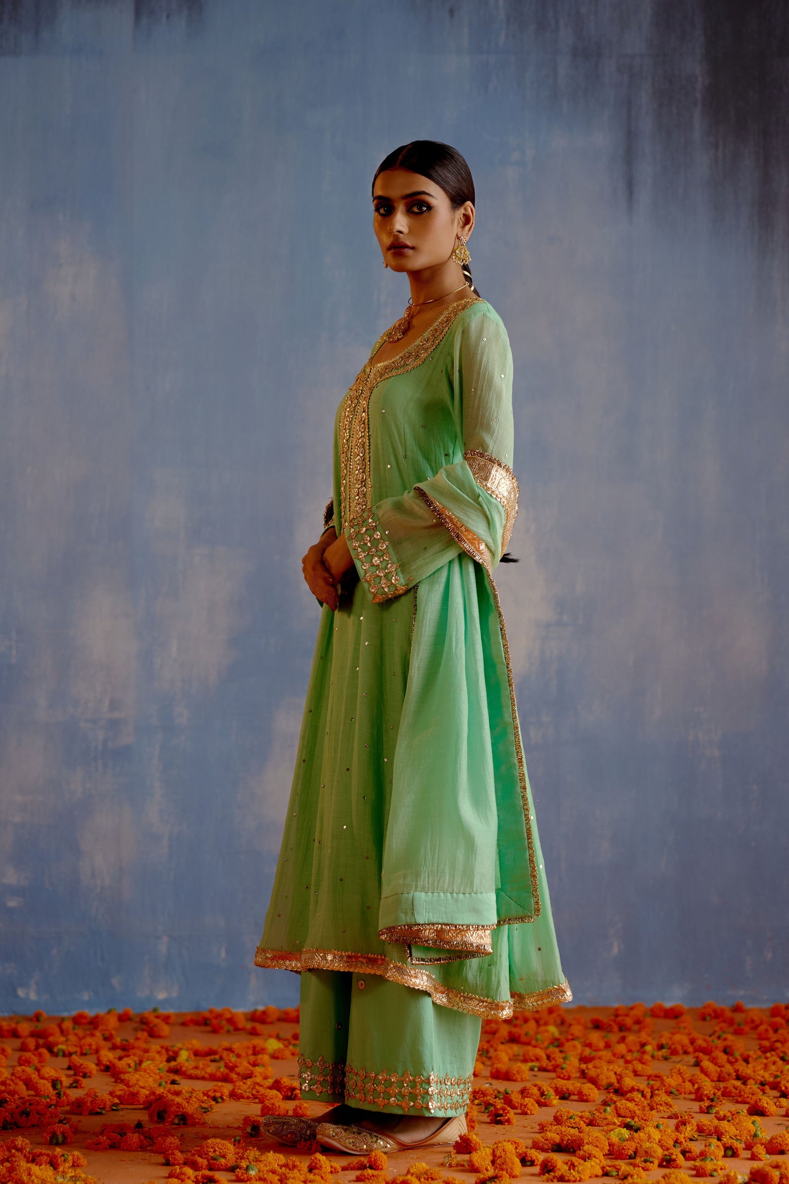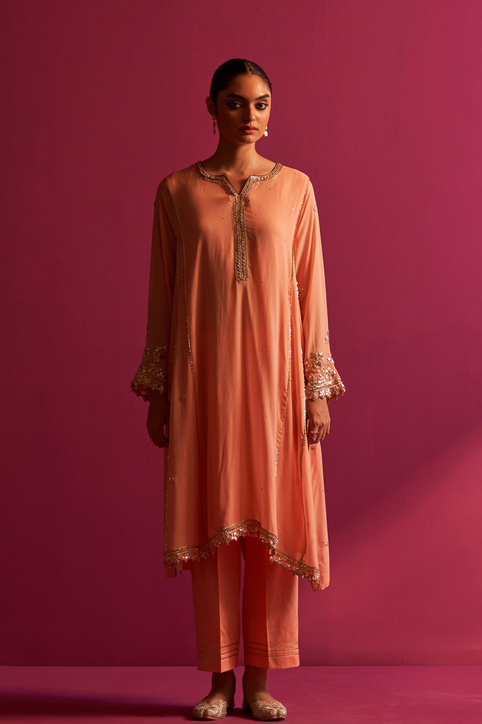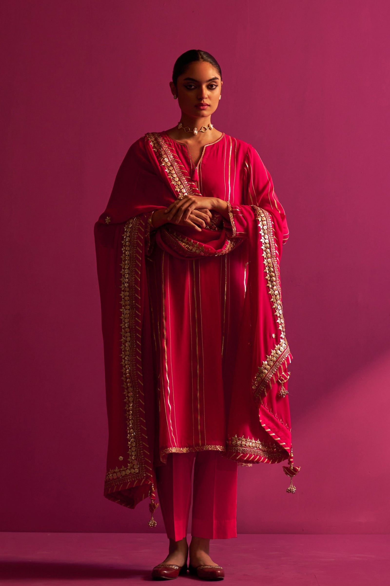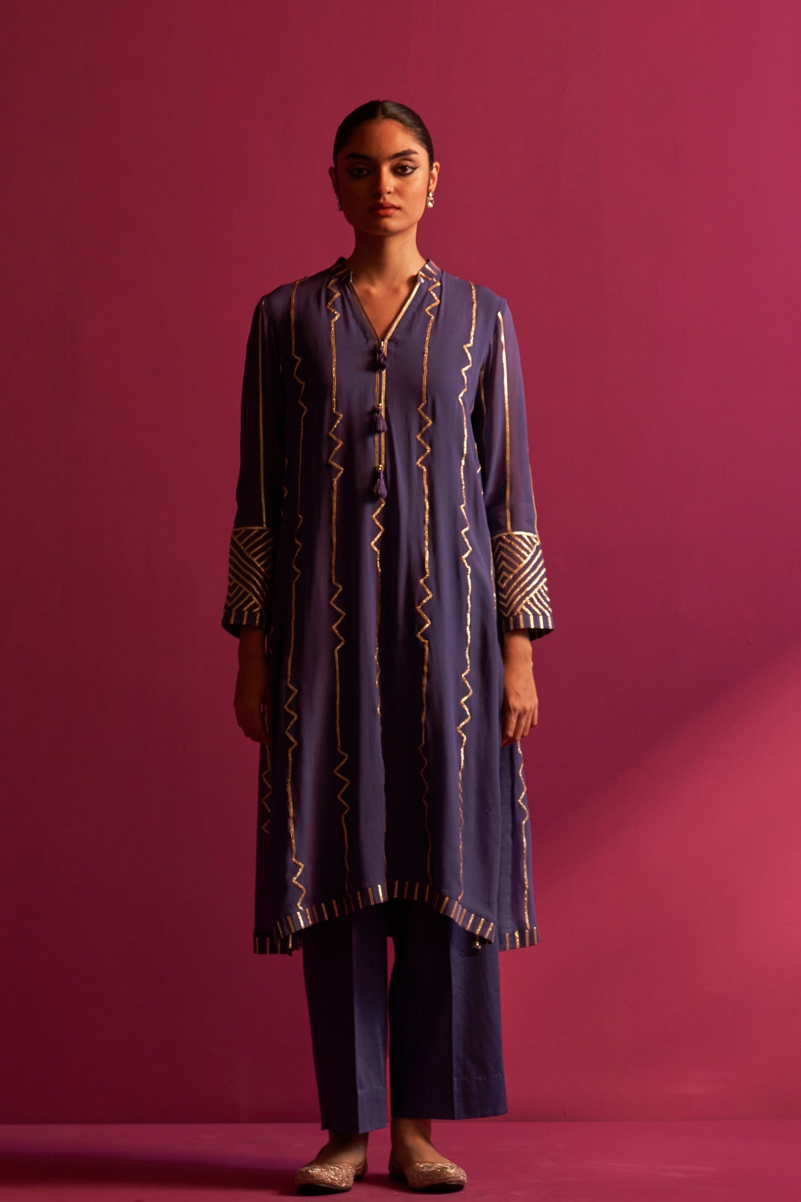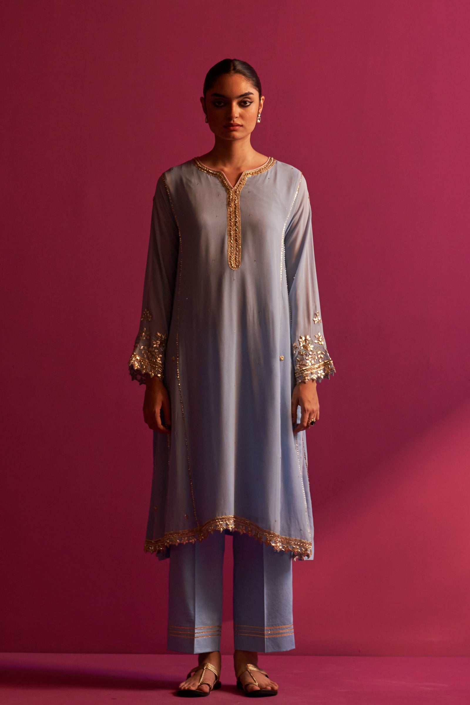 • With the time that passes her charm fluoresces. Brown-earthy, warm a natural allure kurta on georgette and dupatta on contrasting colour paired with straight pants. Gota, beads and dhanak hand embroidery in dull gold