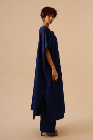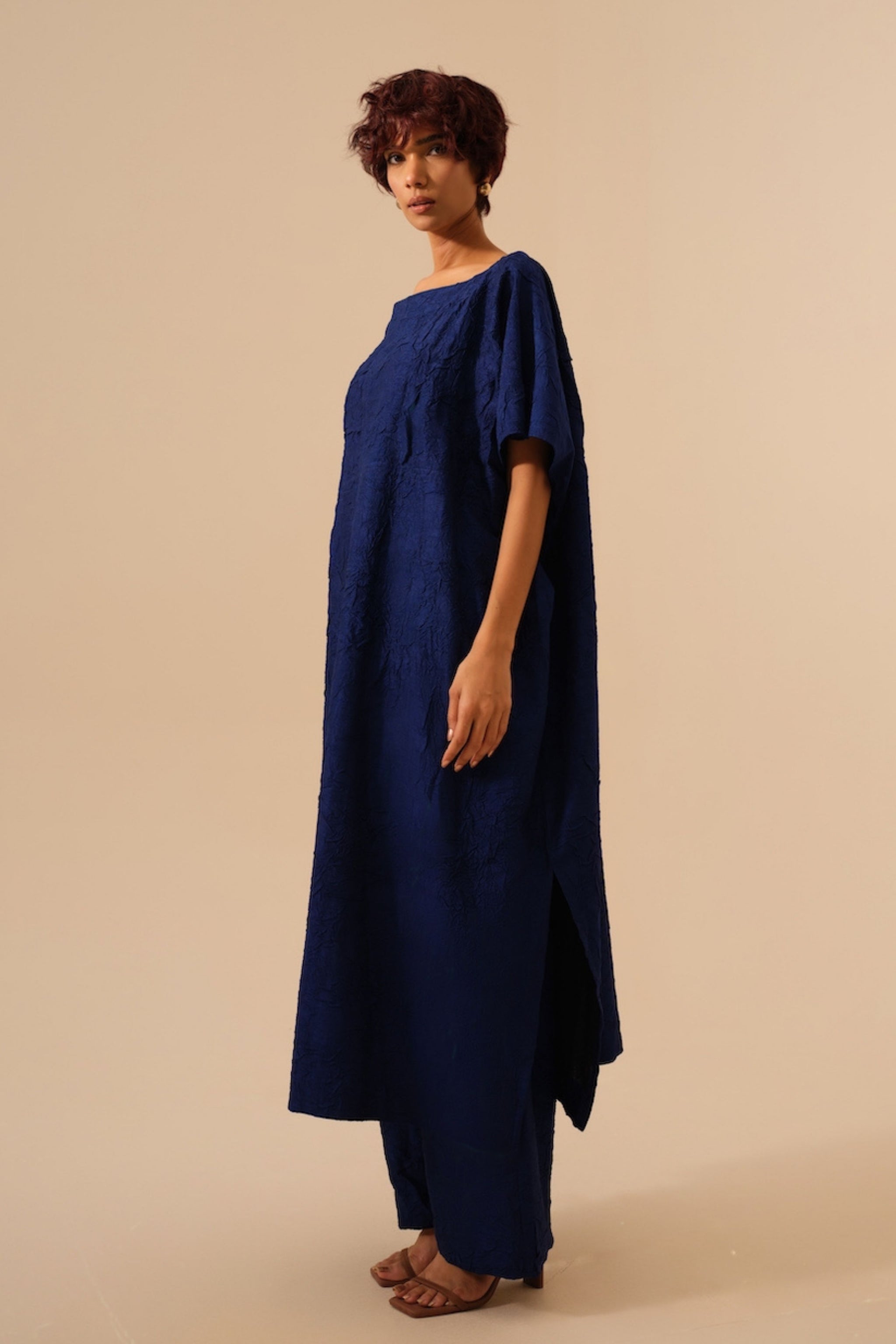 • A kaftan inspired tunic crafted in hand crushed silk, offering a fluid drape and effortless movement. Designed with a closed neckline, it can be styled both as a dress or layered as a tunic. Its versatile silhouette and in house crushed texture embody understated sophistication and ease.