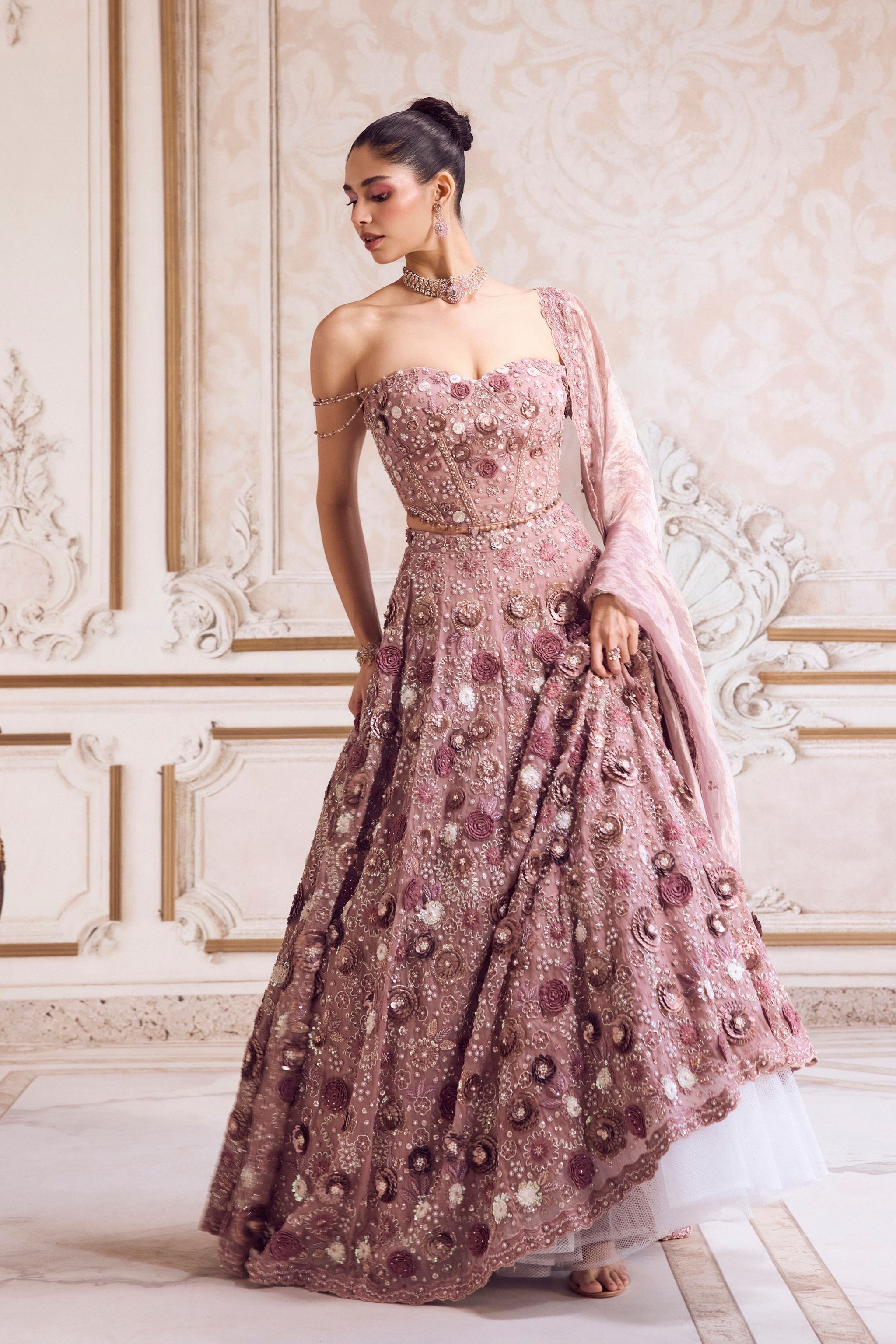 • Components: Corset, Lehenga, Dupatta (3)