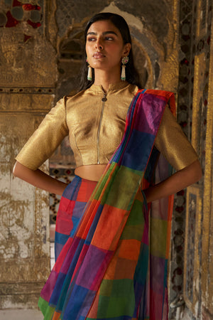 • Soft organza maxi skirt in bright multicolour checks. Draped straight cut with hand-applied pleats and a free-flowing panel at the waist, mimicking a sari drape. Concealed side zip closure. Garment is fully lined. Model is 5’8” and is wearing size XS for reference.