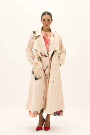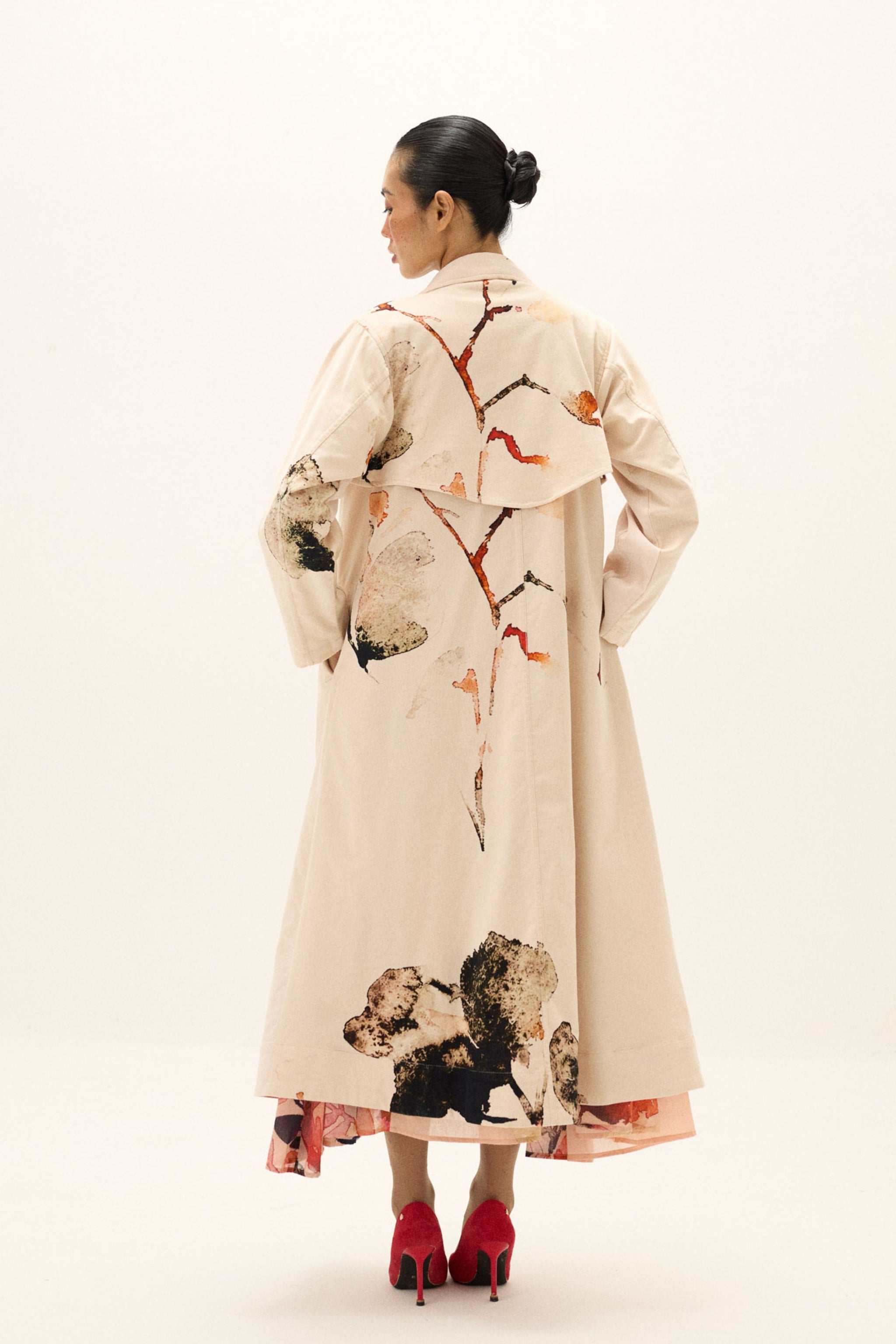 • A longline coat in soft corduroy, printed with abstract botanical motifs in earthy tones. Designed with a wide lapel collar, storm flap, and side pockets, it balances structure with ease. The textured fabric adds depth, while the relaxed silhouette makes it ideal for layering over dresses or separates. Sleeve length- 21", Garment length- 49".