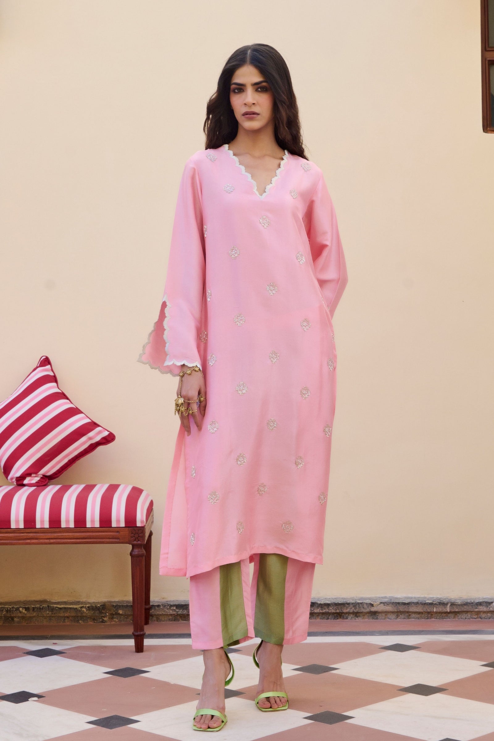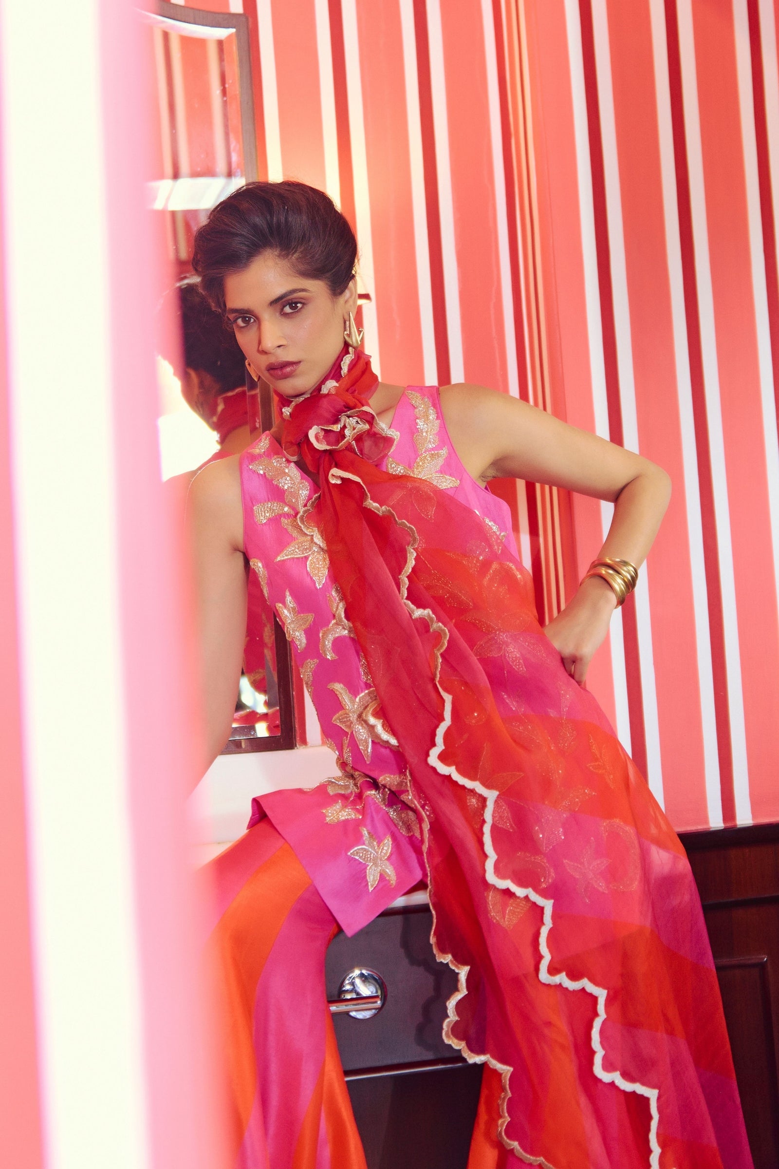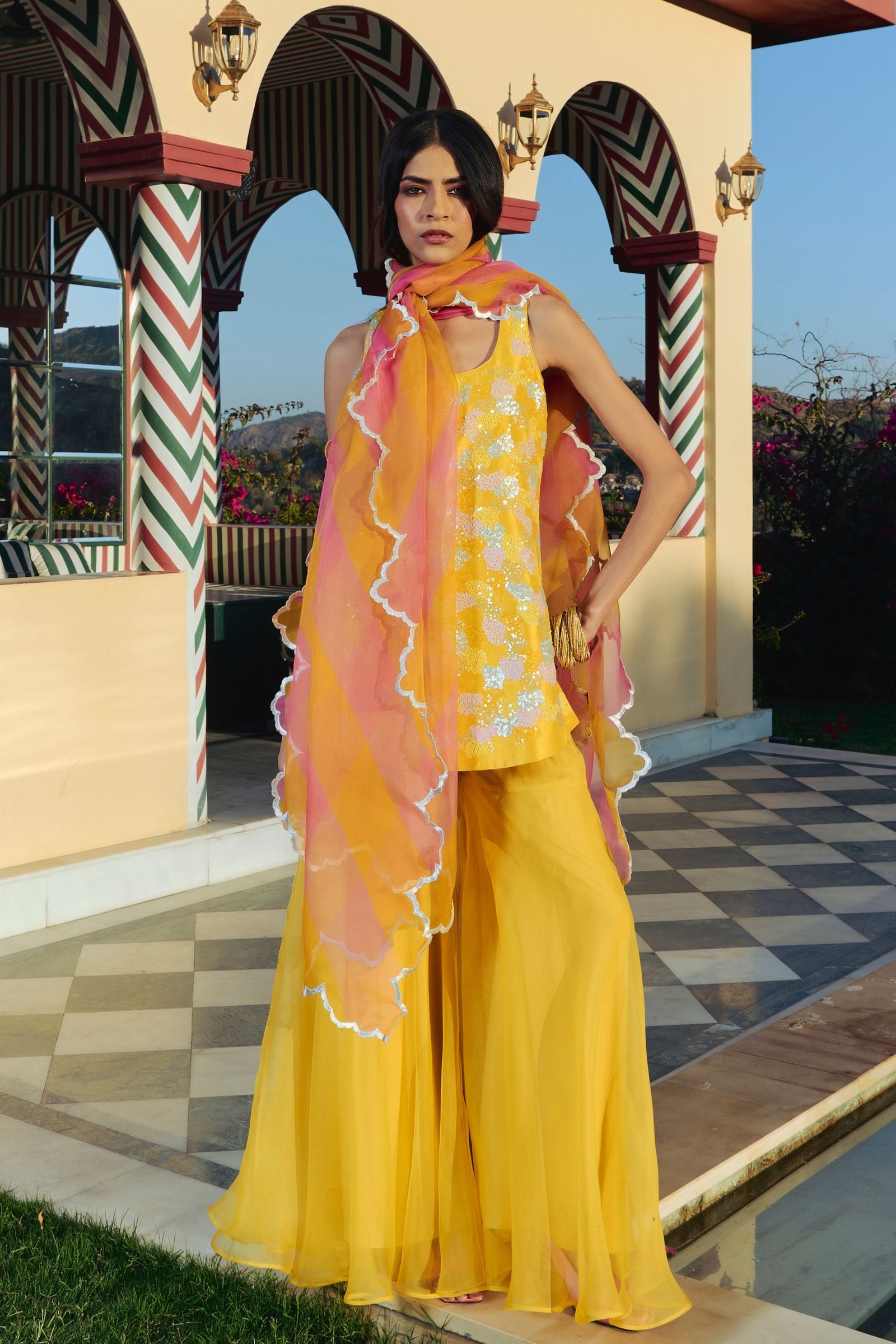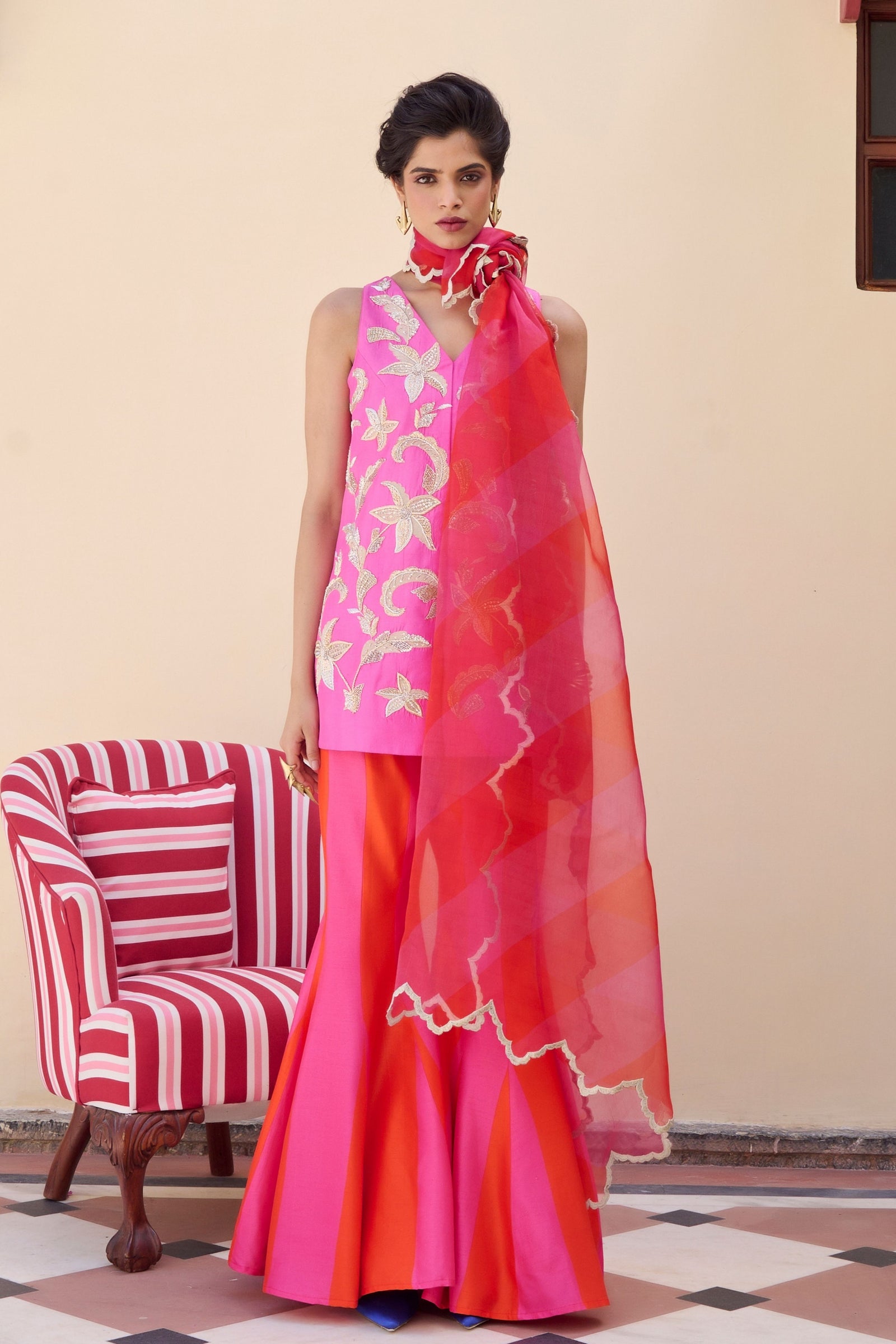 • Our exquisite pink jacket sharara set features delicate Paisley motifs, elegantly highlighted with intricate zardozi and sequins embroidery. This luxurious design blends traditional artistry with modern elegance, creating a captivating statement piece. Paired effortlessly with a flared sharara, this ensemble is perfect for festive occasions and celebrations.