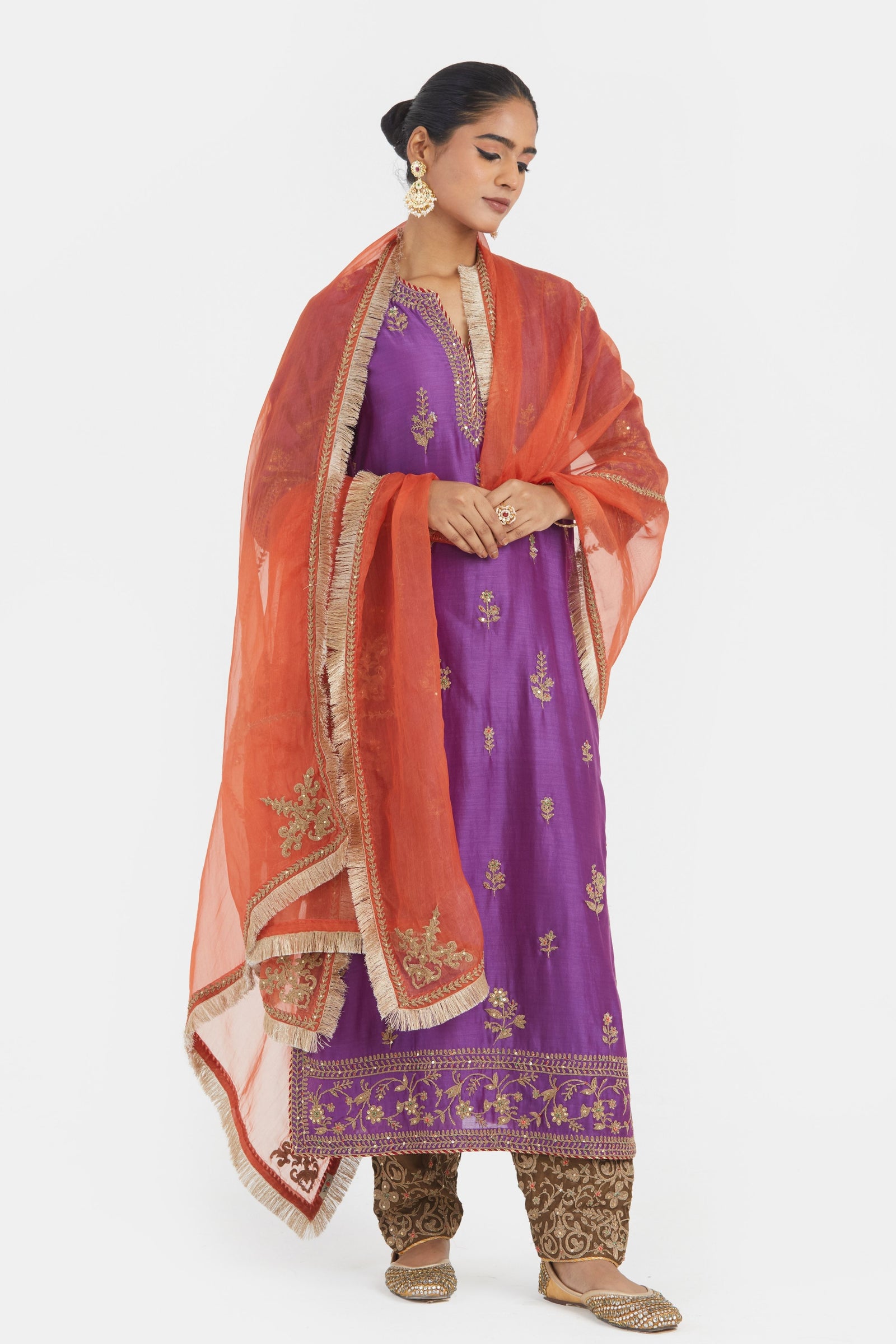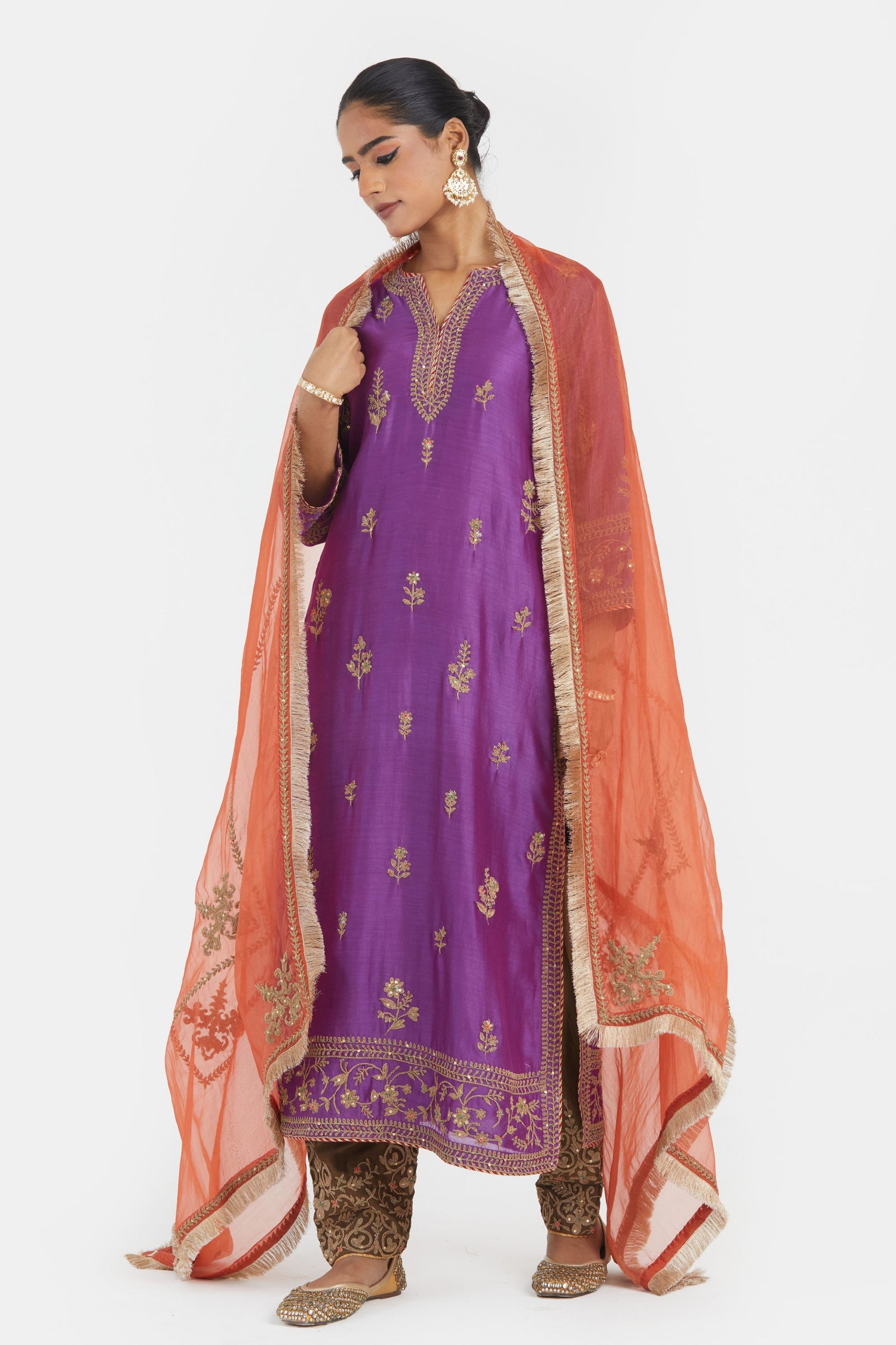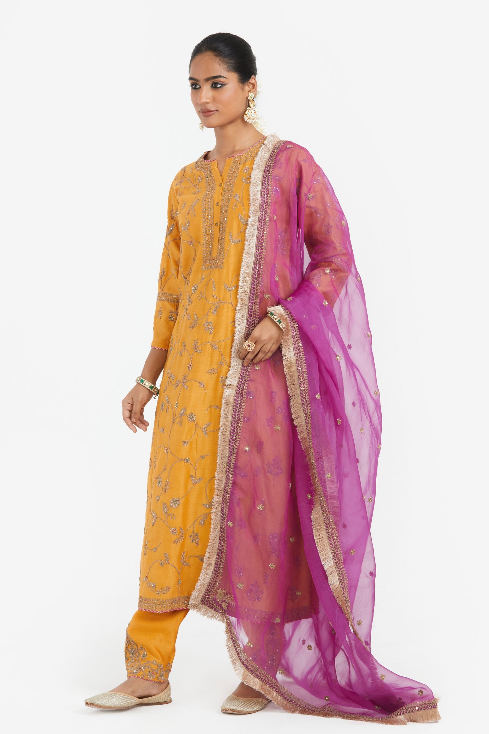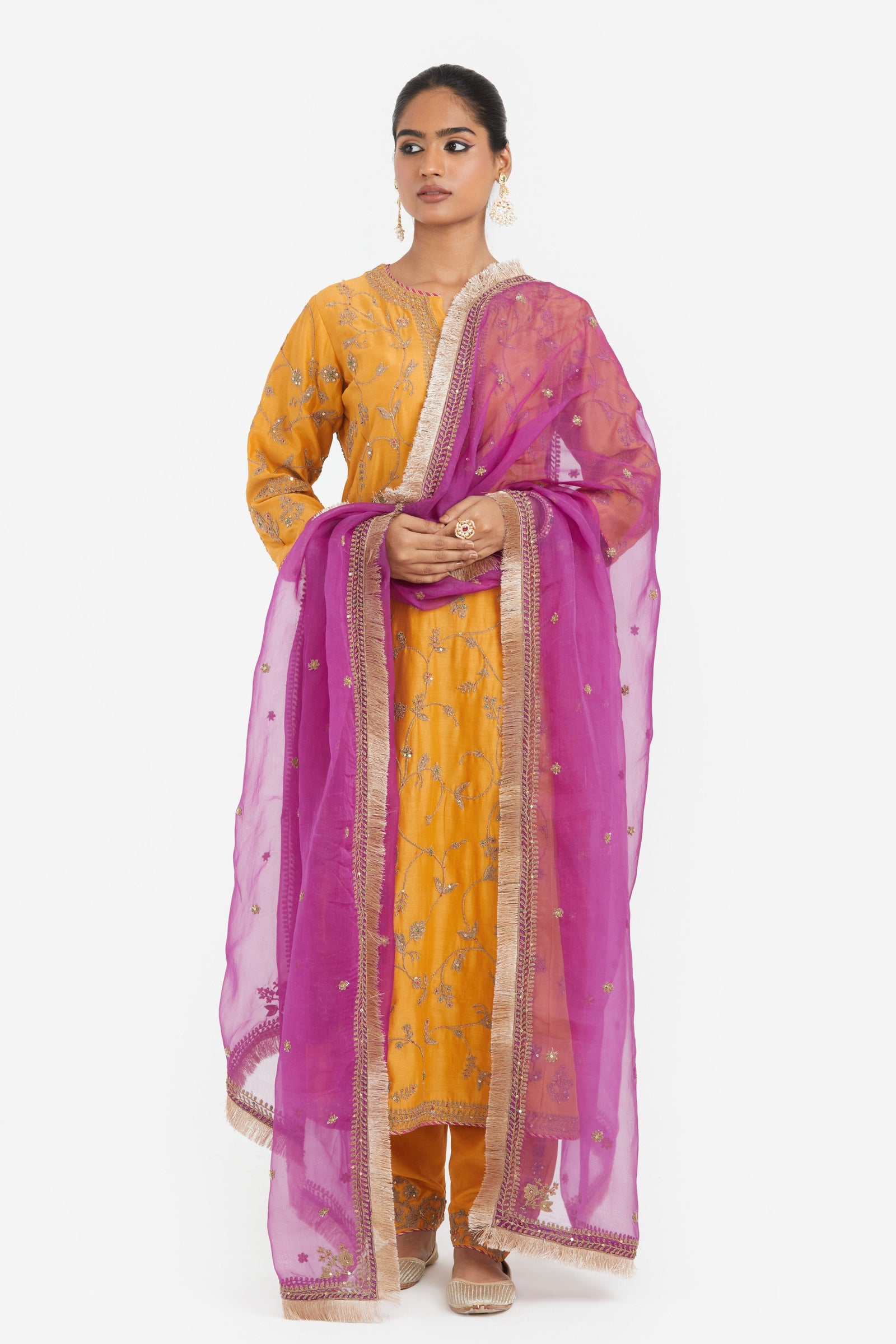 • Deep yellow silk chanderi kurta with gold jaal embroidery, floral booti, sequin-bead highlights, and contrast gota piping. Paired with a 40-kali chanderi lehenga featuring gota embroidery and contrast facings. Finished with a purple organza dupatta adorned with embroidery, beadwork, and zari fringe lace