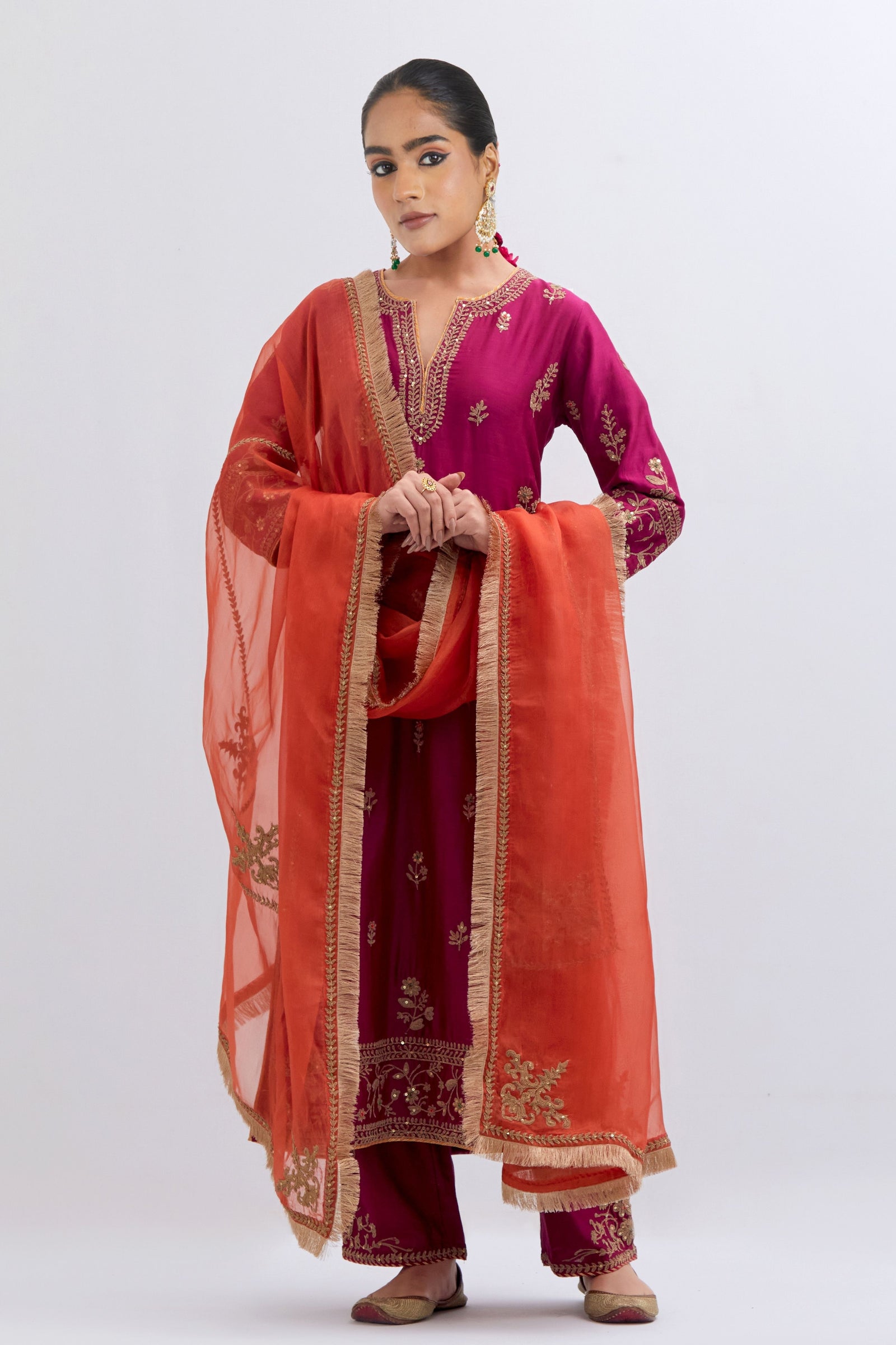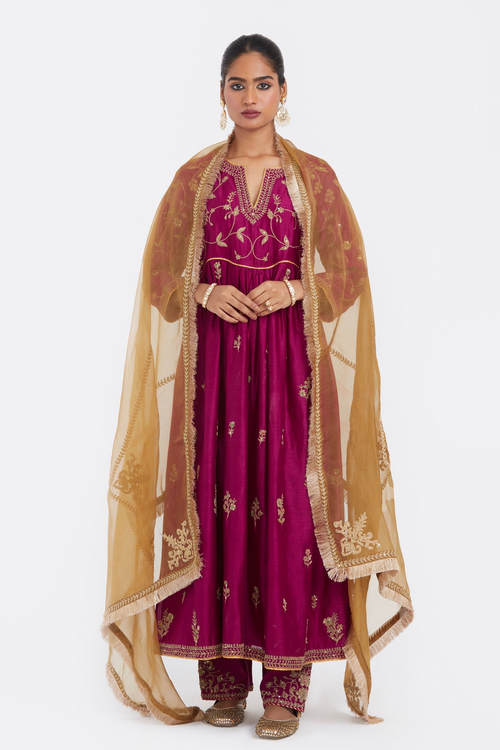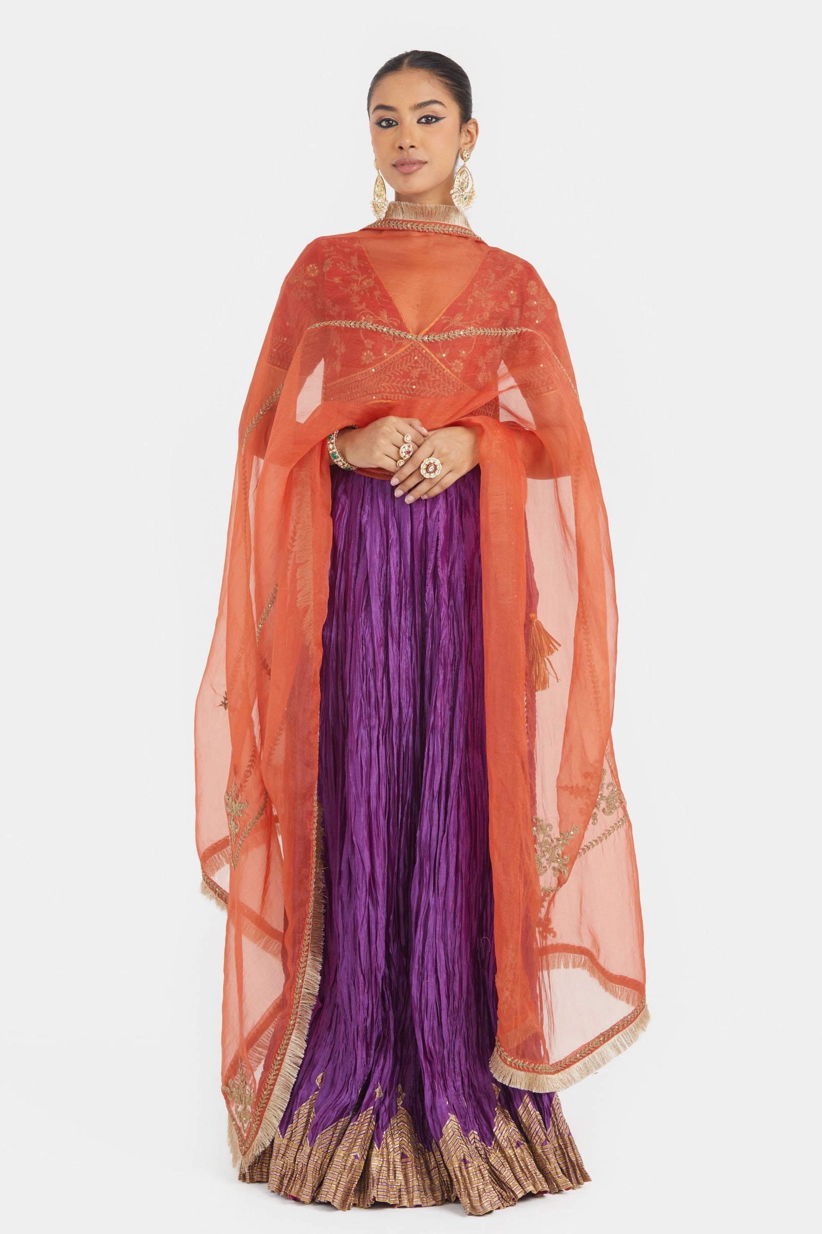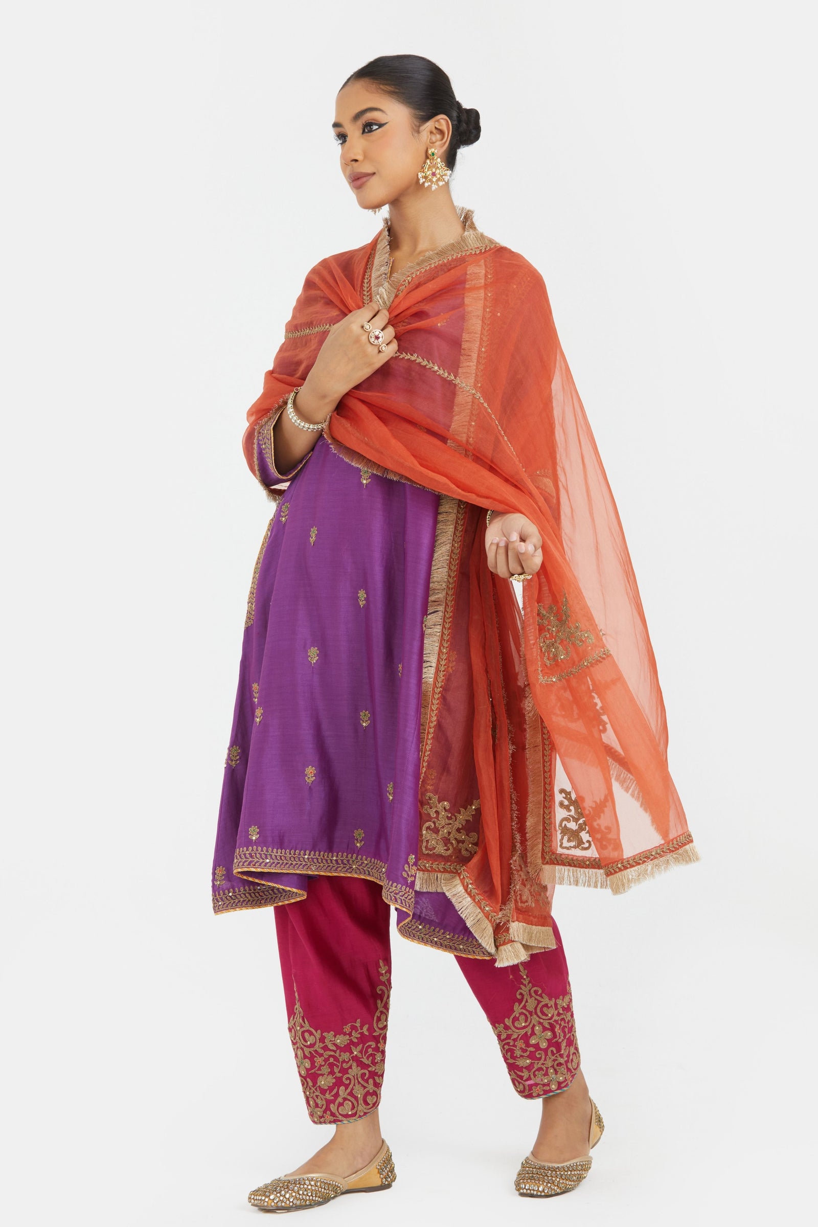 • Deep yellow silk chanderi kurta with gold jaal embroidery, floral booti, sequin-bead highlights, and contrast gota piping. Paired with a 40-kali chanderi lehenga featuring gota embroidery and contrast facings. Finished with a purple organza dupatta adorned with embroidery, beadwork, and zari fringe lace