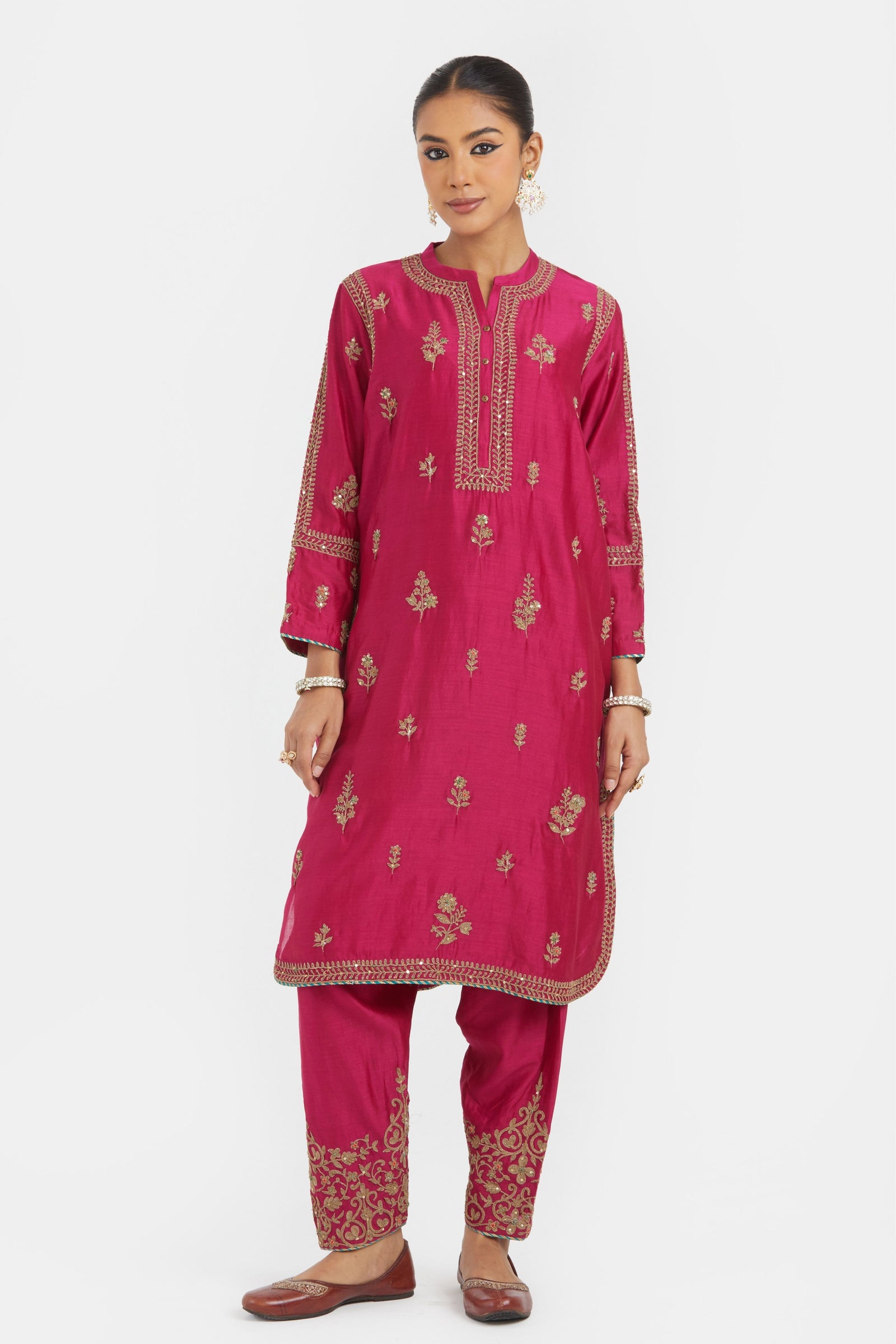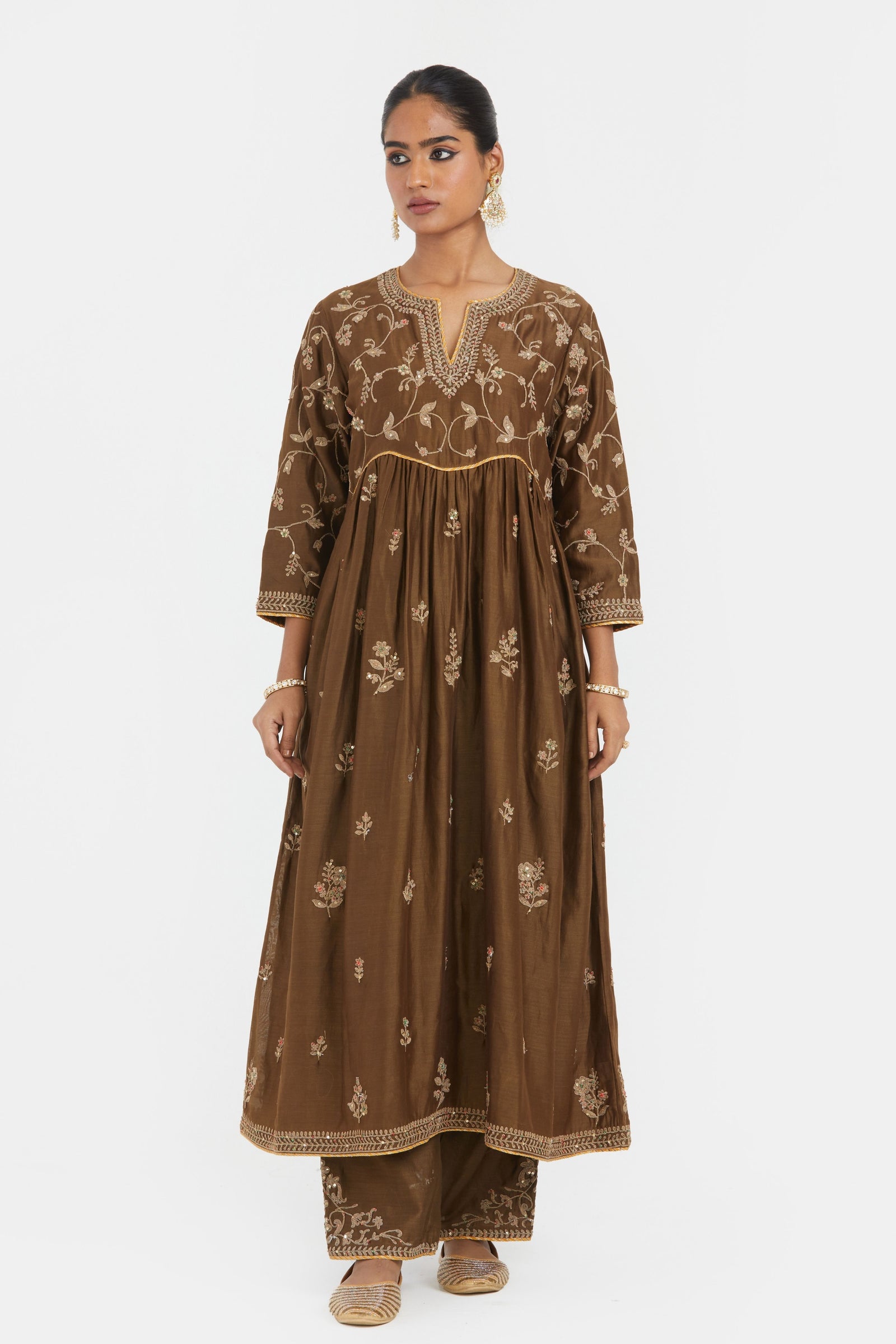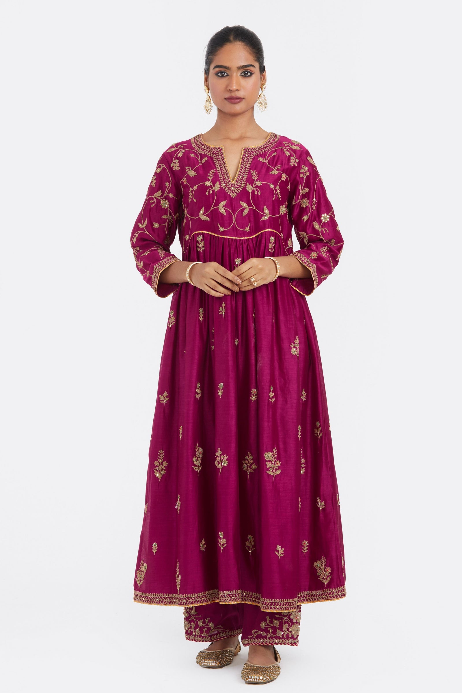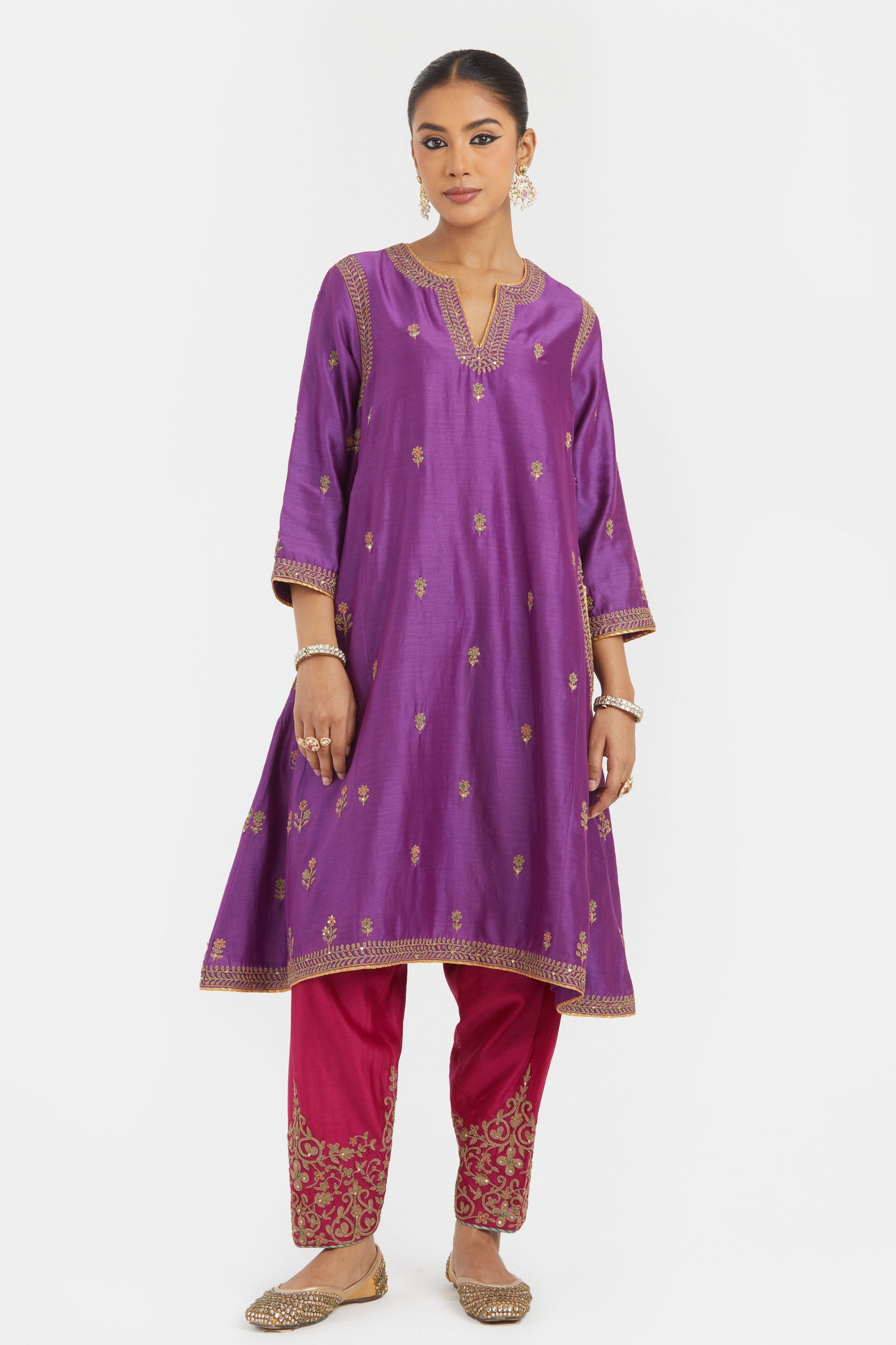 • Deep yellow silk chanderi kurta with gold jaal embroidery, floral booti, sequin-bead highlights, and contrast gota piping. Paired with a 40-kali chanderi lehenga featuring gota embroidery and contrast facings. Finished with a purple organza dupatta adorned with embroidery, beadwork, and zari fringe lace