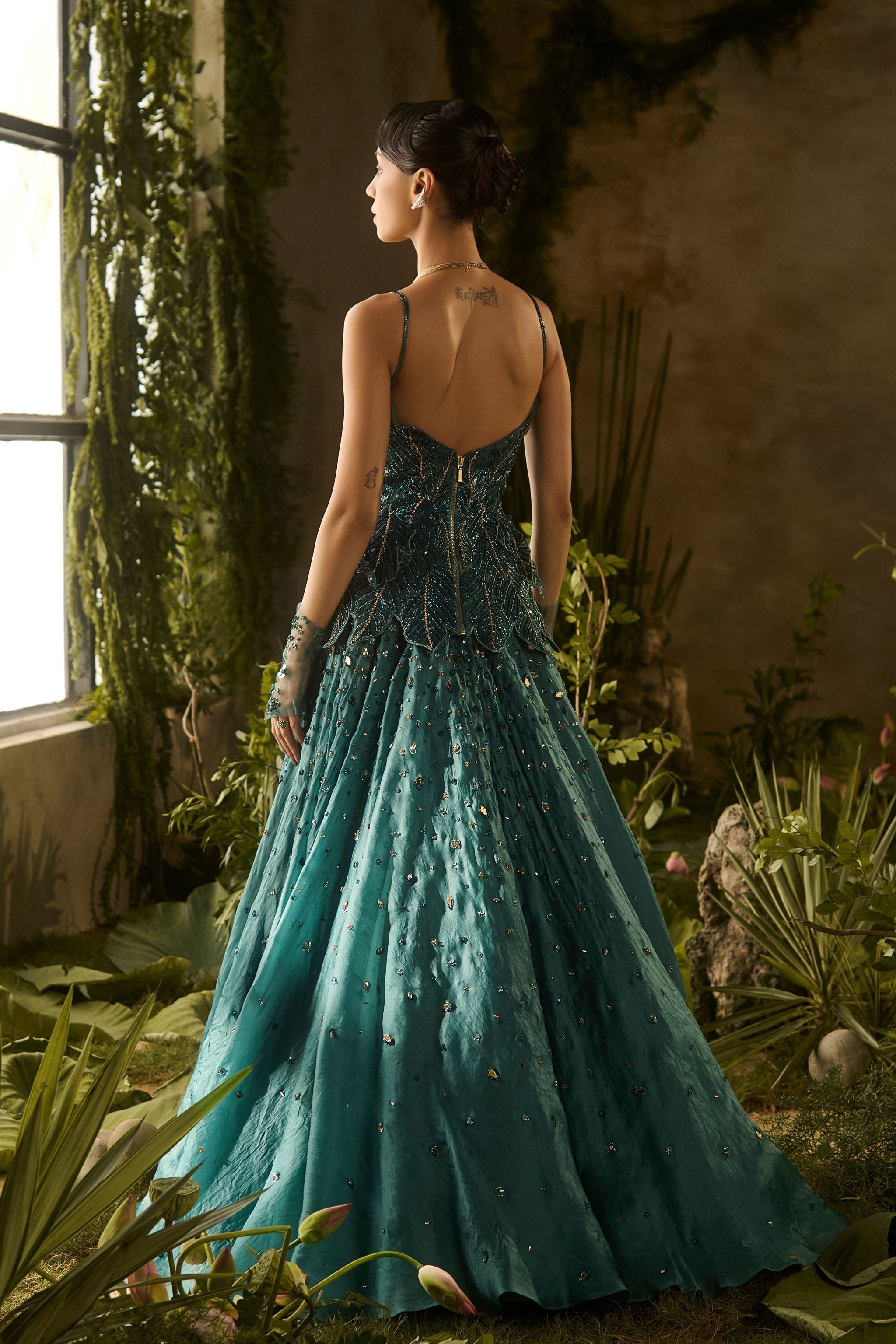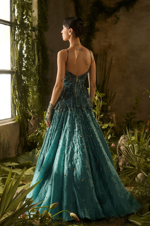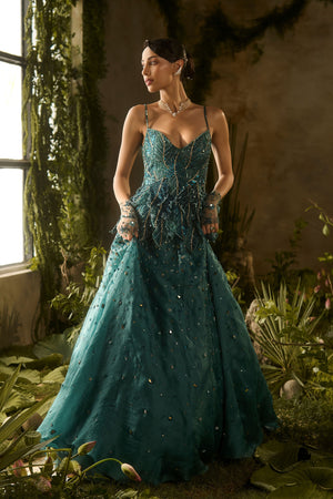 • A deep neckline with thin straps and a fitted bodice richly adorned with intricate beadwork, sequins, and embroidery in leaf-like patterns. The embellishments cascade downward, blending seamlessly into the voluminous skirt that sparkles with scattered sequin details.