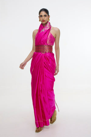 • Introducing silk dialogue, a collection that celebrates the playful dance between oriental culture and banarasi heritage–where motifs, ideas, and techniques come together through a craft-centric lens. Our hot pink saree is handwoven in kadhwa banarasi technique with intricate oriental-inspired motifs. Crafted in the finest satin silk, it is among the most fluid and drapeable sarees we’ve created, offering endless styling possibilities. We recommend elevating the hot pink drape with a sleek gold belt to cinch the waist and give a polished look. This one's perfect for intimate crad nights, cozy diwali dinners, or any close knit celebration.
