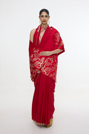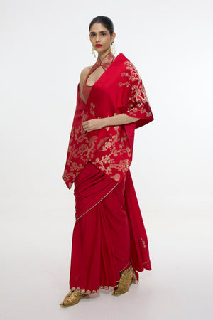 • Introducing silk dialogue, a collection that celebrates the playful dance between oriental culture and banarasi heritage–where motifs, ideas, and techniques come together through a craft-centric lens. Our red satin silk shawl handwoven in kadhwa banarasi technique features intricate cherry blossom patterns inspired by ancient oriental motifs. Crafted in the finest satin silk, it drapes with effortless fluidity, adding depth and drama when layered over sarees, lehengas, or contemporary silhouettes. We recommend draping it over a solid banarasi saree for a rich festive look, or style it as a statement layer over contemporary separates. This one's perfect for winter weddings, festive evenings, and intimate celebrations.