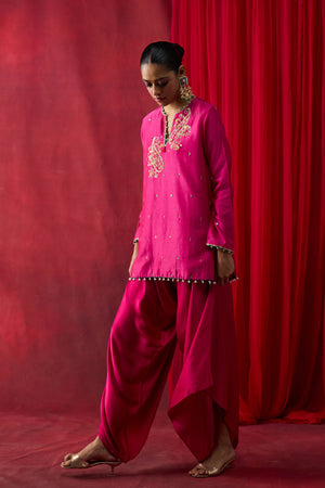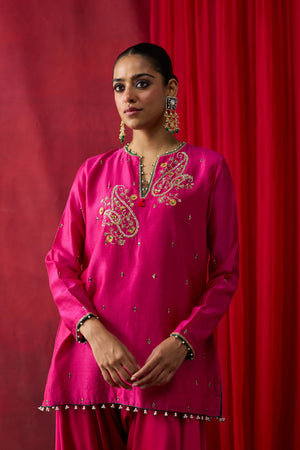 • Pink silk chanderi top with thread and hand embroidery, featuring pearl tassel details on the hem. Paired with satin cowl pants.