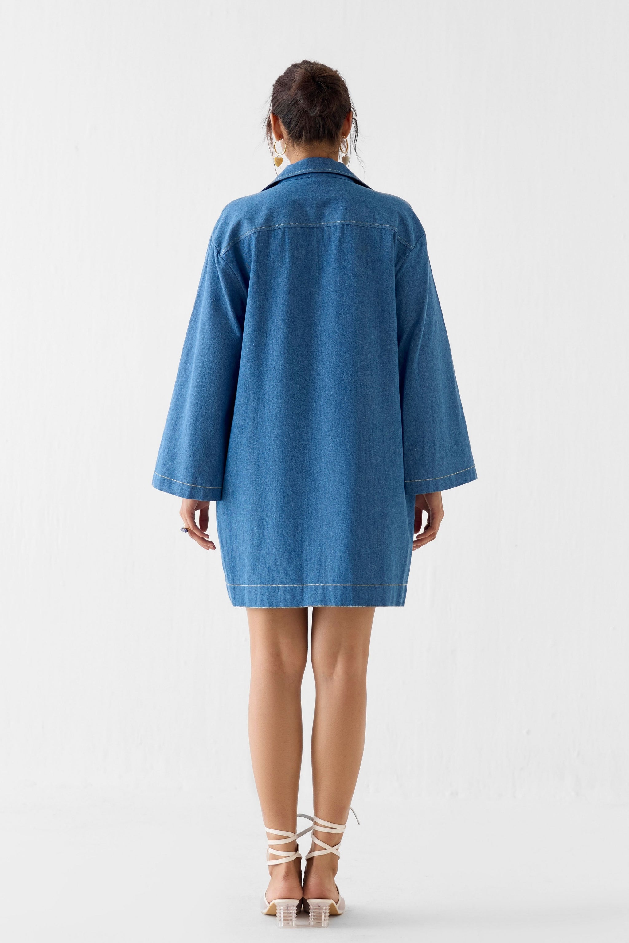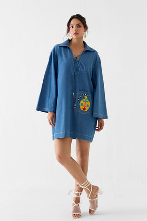 • The indigo short dress crafted from our 100% denim fabrication, trans-seasonal, is a statement piece. The shirt, made in our soft faded indigo denim, reflects fine artisanal craftsmanship, has a boxy fit. With knots on the collar, the dress has lace & bead detail. Featuring a summery look, it has been hand embroidered with patchwork pottery made with fabric in pop colours. Wear it with heels for an elegant look. The model is wearing a size m.