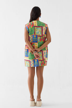 • The johari short dress crafted from our stunning 100% cotton fabrication, trans-seasonal, is a statement piece. Made in our hand drawn johari patchwork print with all over paisleys, reflects fine artisanal craftsmanship. This short dress is tailored in a straight, shift dress silhouette and is fully lined for comfort. Featuring a round neckline, the piece is elevated with delicate potli and shell button tassles. It has side pockets and a front zipper. Wear it with strappy heels for an elegant look. The model is wearing a size m.