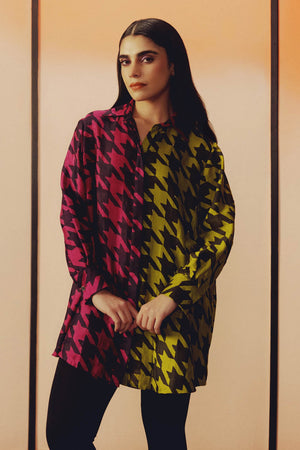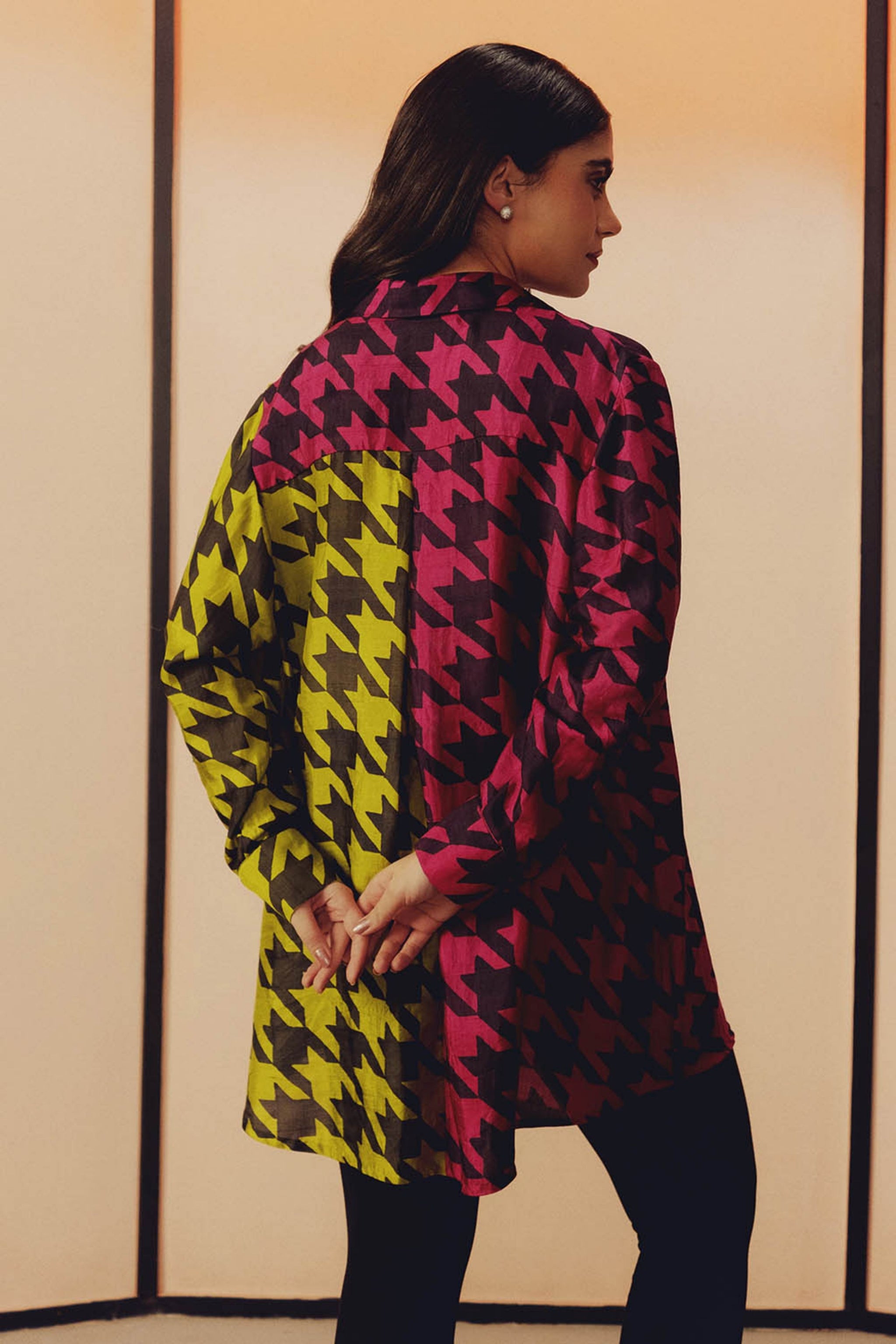 • This handwoven mulberry silk shirt features a dual colour design with hand block printing, highlighted by subtle glass beadwork and is designed in classic relaxed fit silhouette.