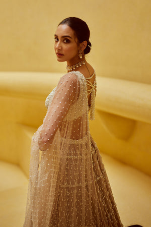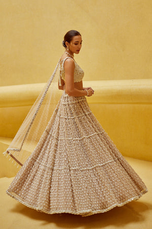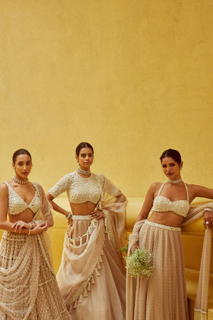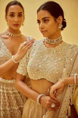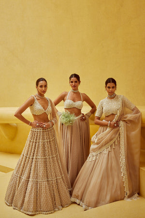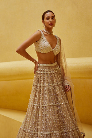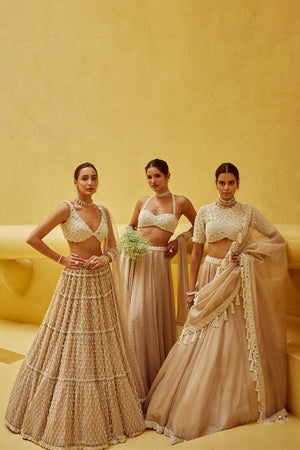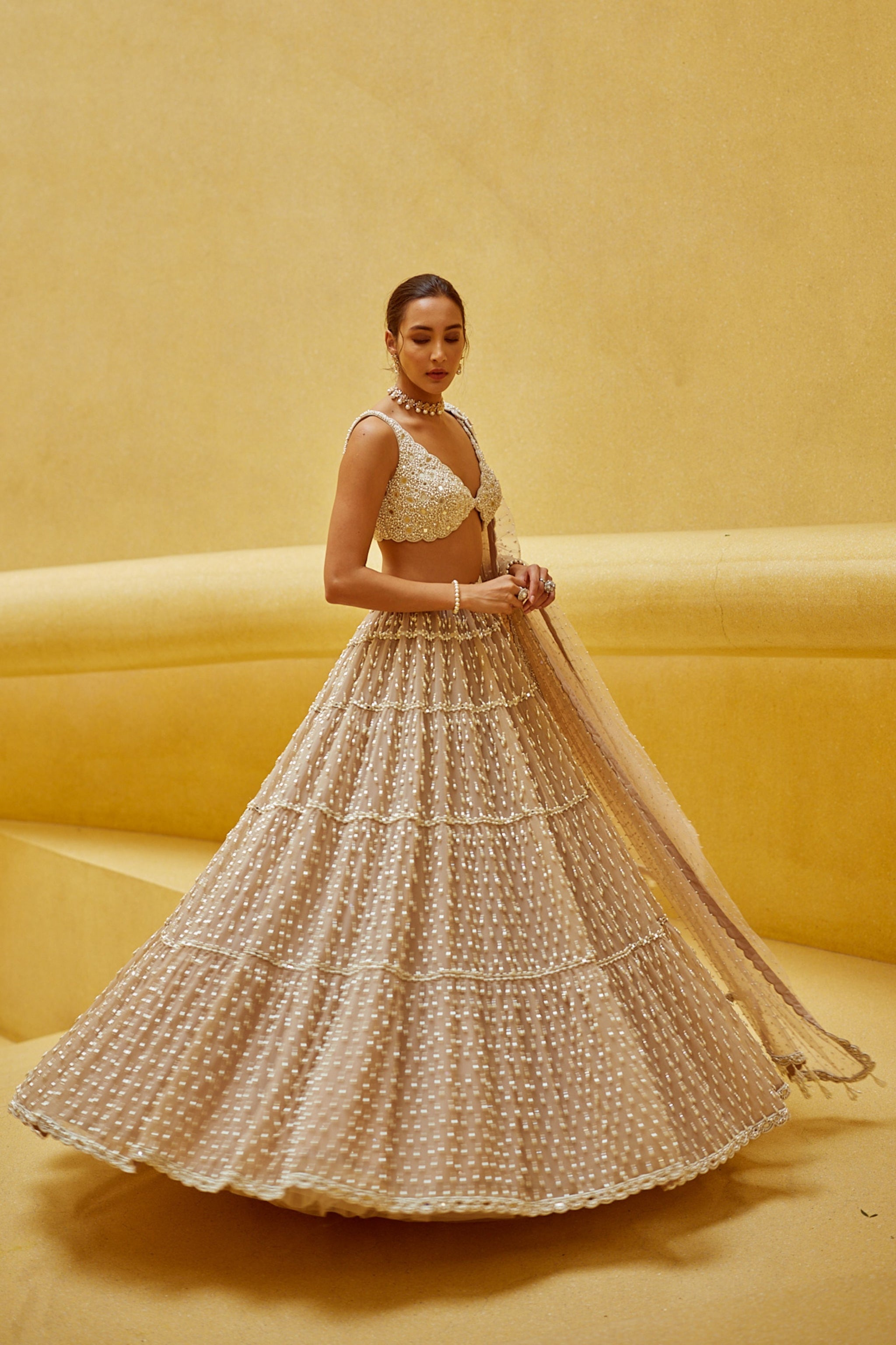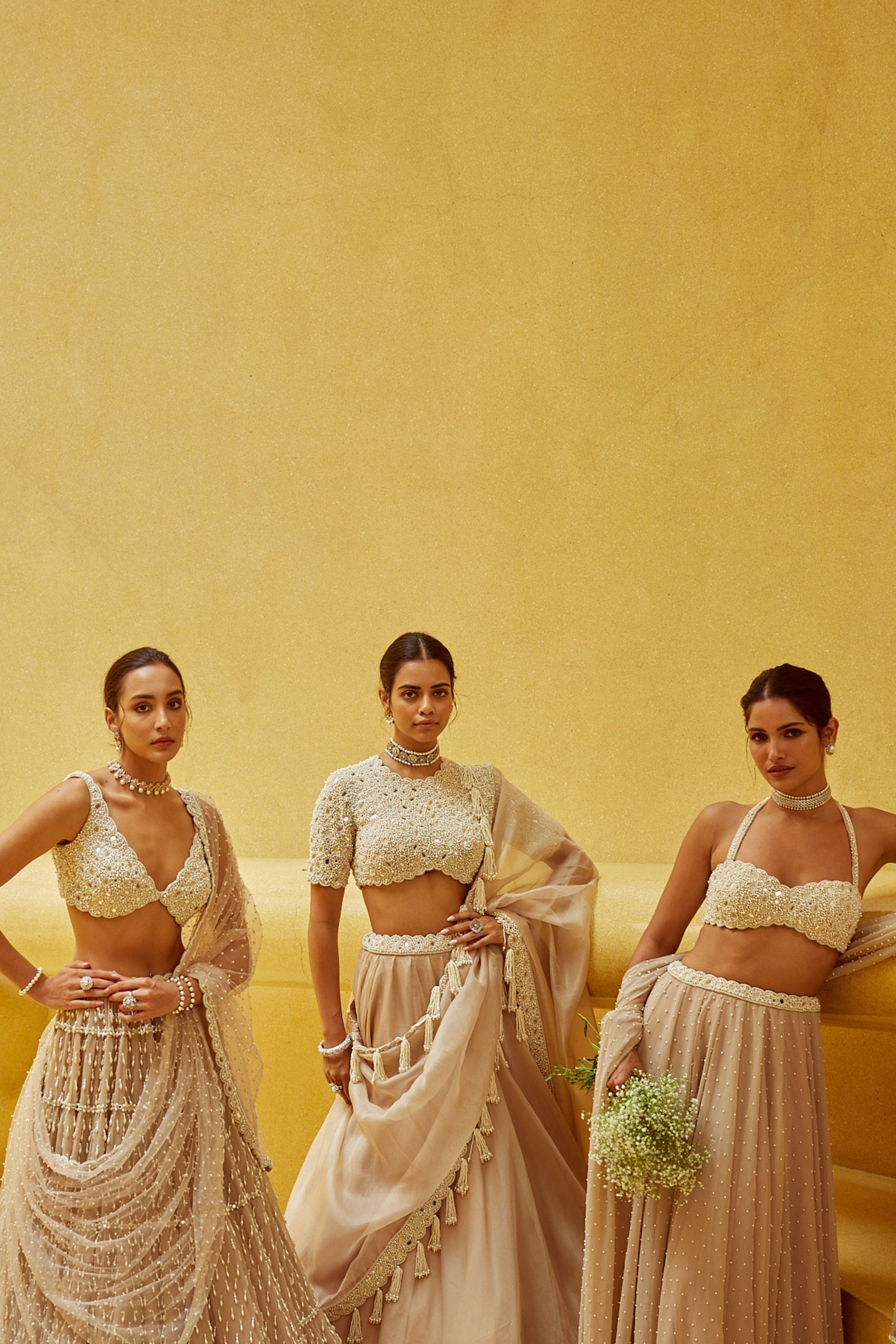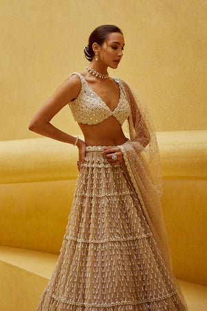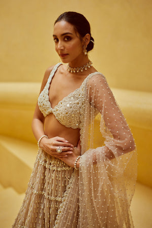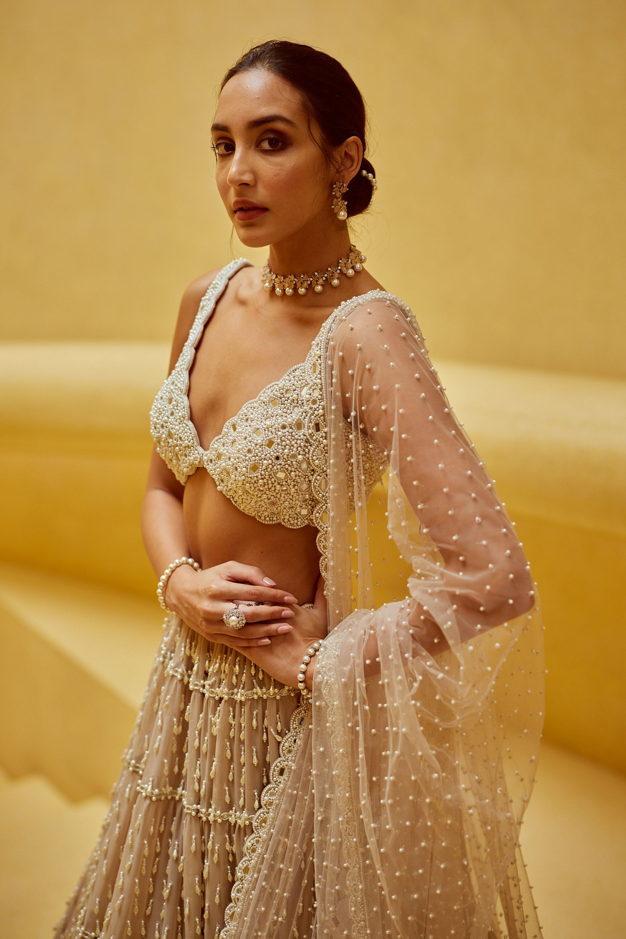 • Hand tucked pearl drop multi tier lehenga and dense mirror pearl blouse paired with tassel dupatta.