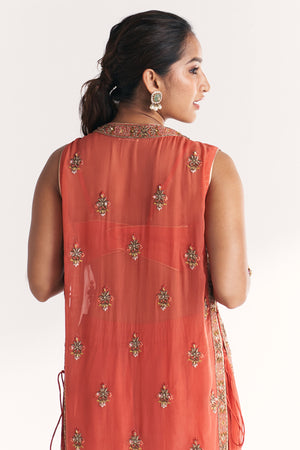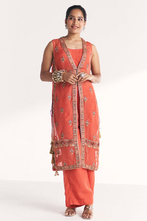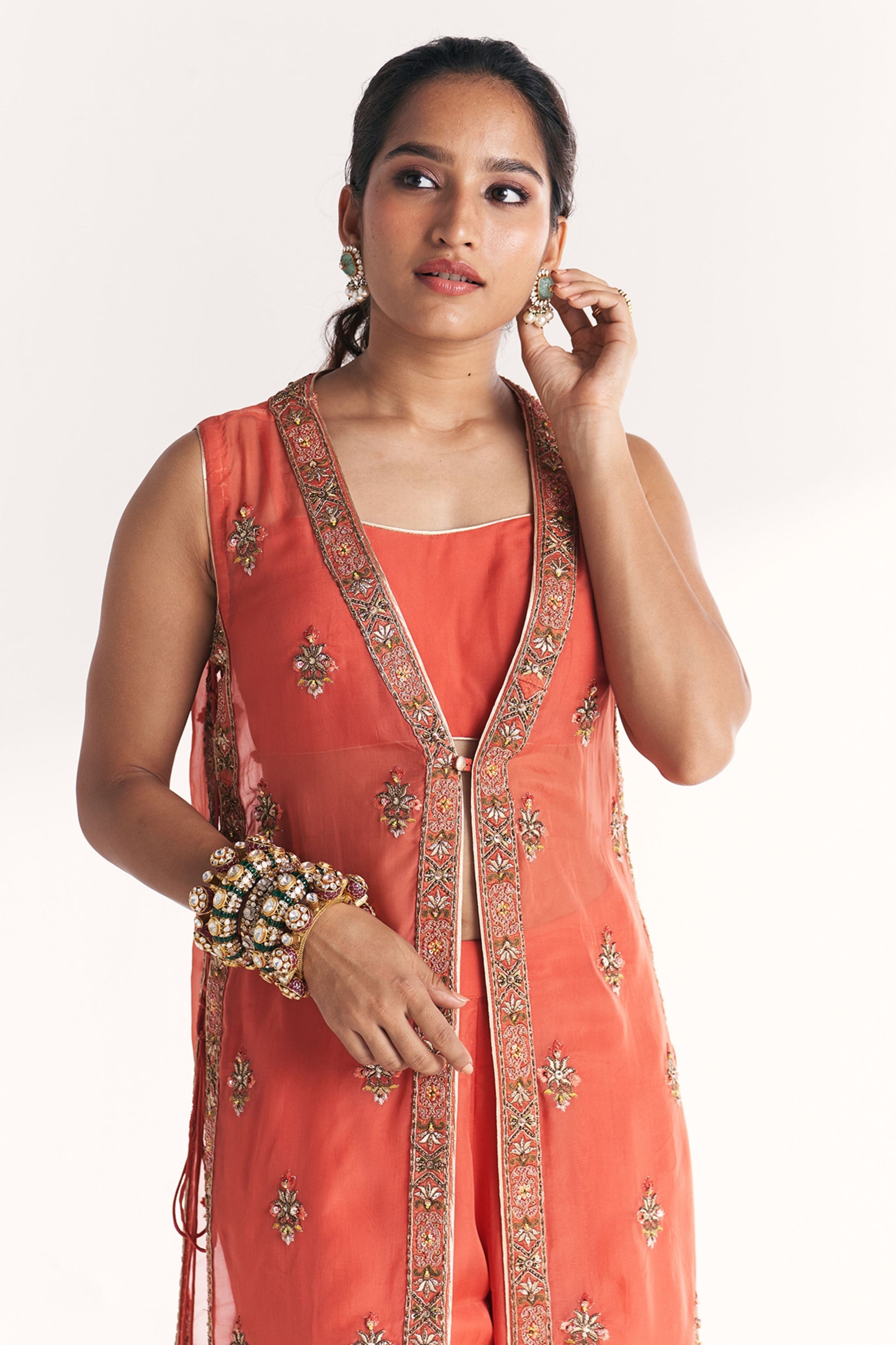 • The set consists of bustier, pants and jacket. The jacket has beautifully embroidered panels which brings the elegance. The set is perfect for the playful festive occasions.