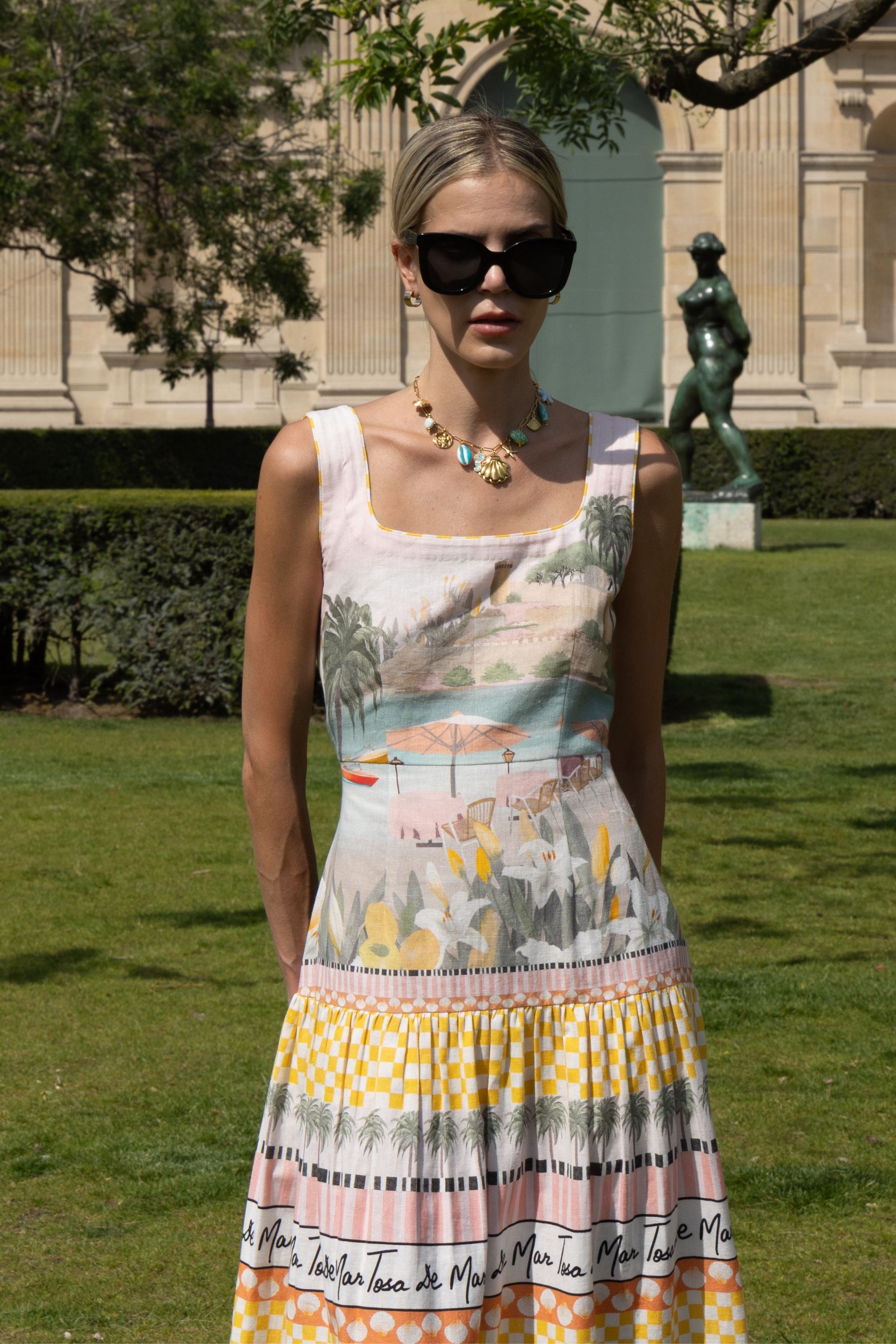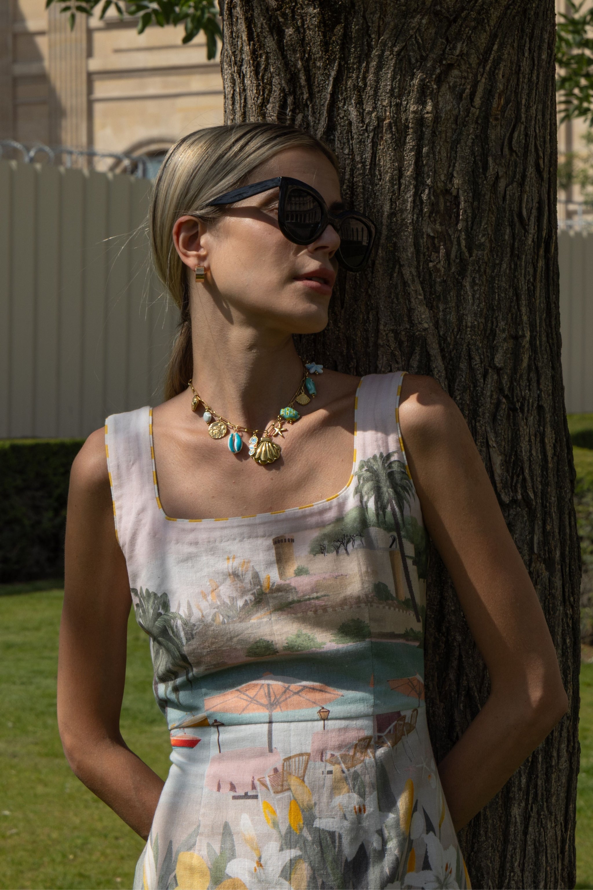 • Channel sun-drenched vacation vibes in this playful printed maxi dress from khushbu rathod label. Designed in a breathable cotton blend, it features a flattering square neckline, a fitted bodice, and a flared tiered skirt. The vibrant print showcases dreamy coastal elements, palm trees, waves, citrus motifs, and cheerful checks, perfect for holiday escapes and summer soirées. Finished with soft pastel hues and a whimsical script at the hem, it’s your go-to for effortless resort chic.