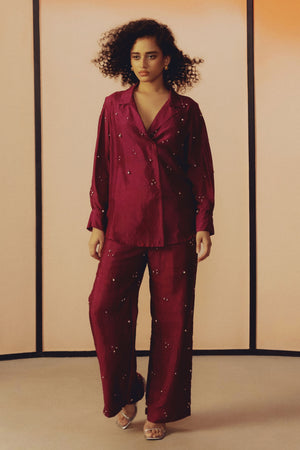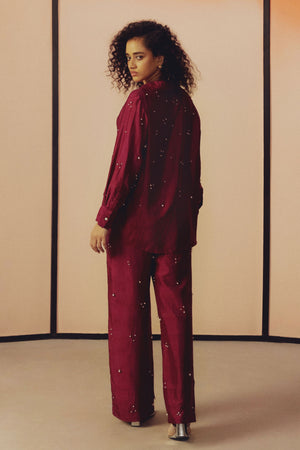 • This handwoven mulberry silk shirt style jacket set features hand embroidered pearl and glass beadwork. Designed in classic easy fit silhouette, it is paired with high waisted pants featuring pockets on both the sides.