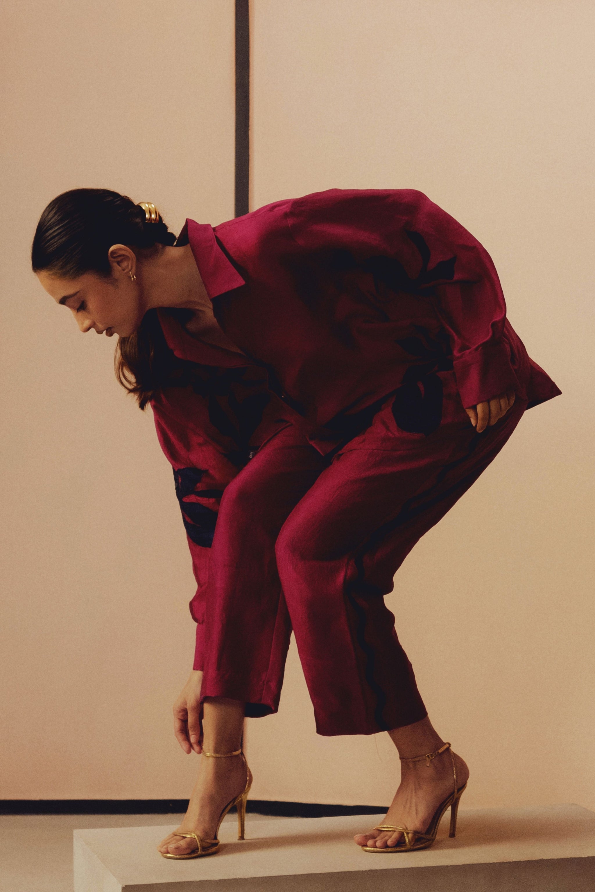 • This handwoven mulberry silk shirt set features contrast floral motif applique enhanced with delicate hand embroidered sequin work. Designed in classic easy fit silhouette, it is paired with narrow, ankle length pants featuring pockets on both sides.