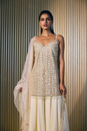 • A noodle strap kurta drenched in delicate glass mirrors paired with a sharara and dupatta