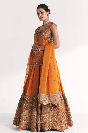 • Mor mustard lehenga consists of three pieces from which the lehenga adorn with heavy and intricate hand embroidery with the cutwork at the hem. The koti handwork consist of various techniques and material. Dupatta with this set completes the look and elevates the elegance.