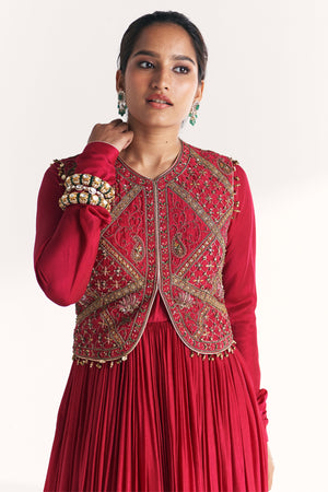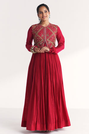 • Pakhi anarkali set consists of dola silk anarkali to give rich and refines look. It comes with fully hand embroidered koti makes it rich and perfect for festive wear.