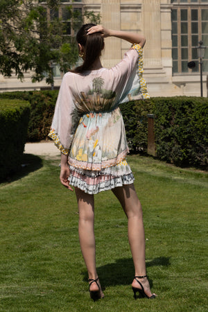 • Playful yet polished, this mini skirt features a vibrant tossa de mar-inspired print, checkered detail, and tropical palm motifs. Designed with pleated panels and delicate button-down accents, it flares out beautifully for a flattering fit. Pair it with the matching bralette or a solid tucked-in top to make an easy vacation statement.