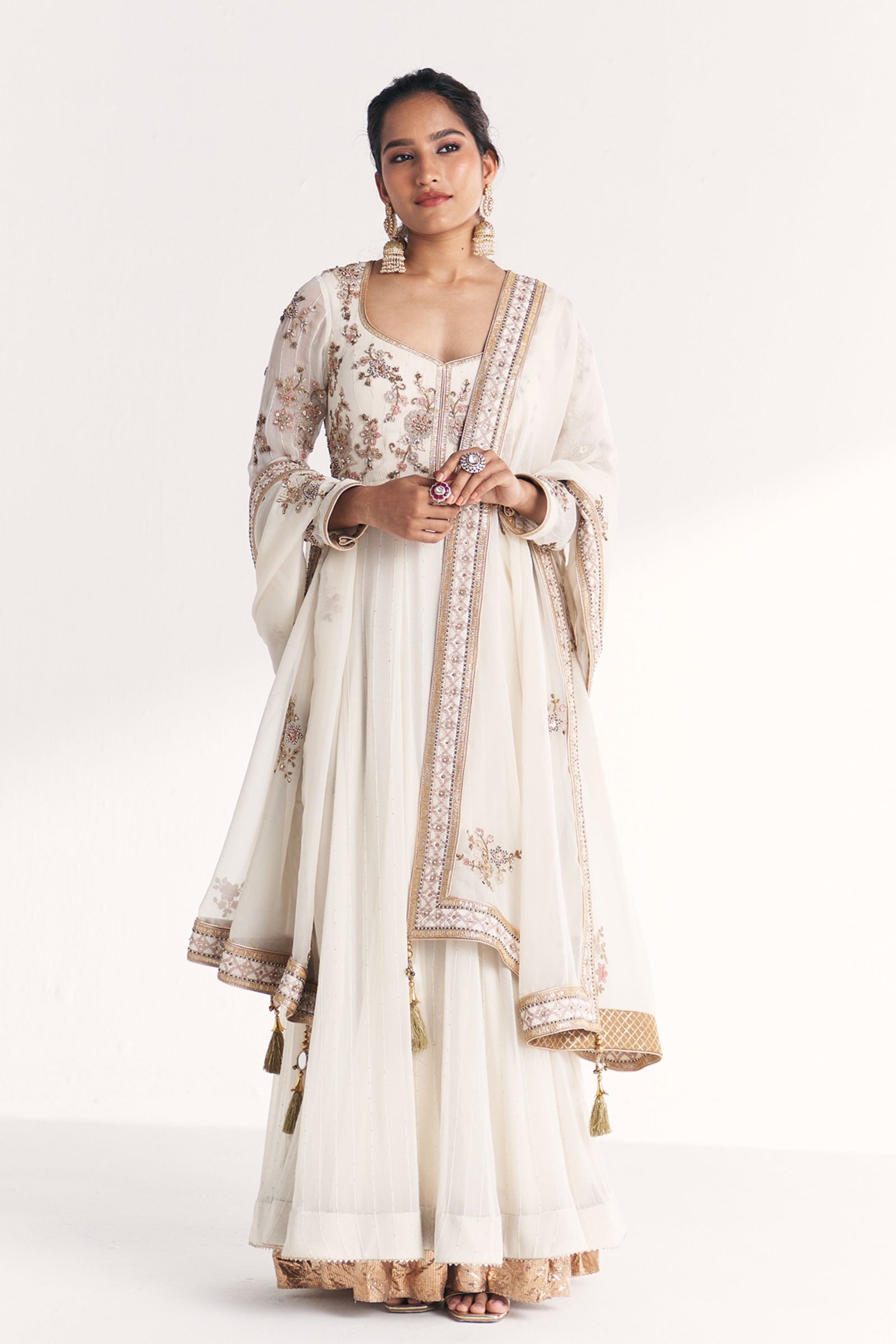 • This set includes a lehenga ,bustier and dupatta.The lehenga is adorned with sequins work along with side tassels and features contrast facing. The bustier consists of ruching.Dupatta consists of gota finishing along with hand embroidery.