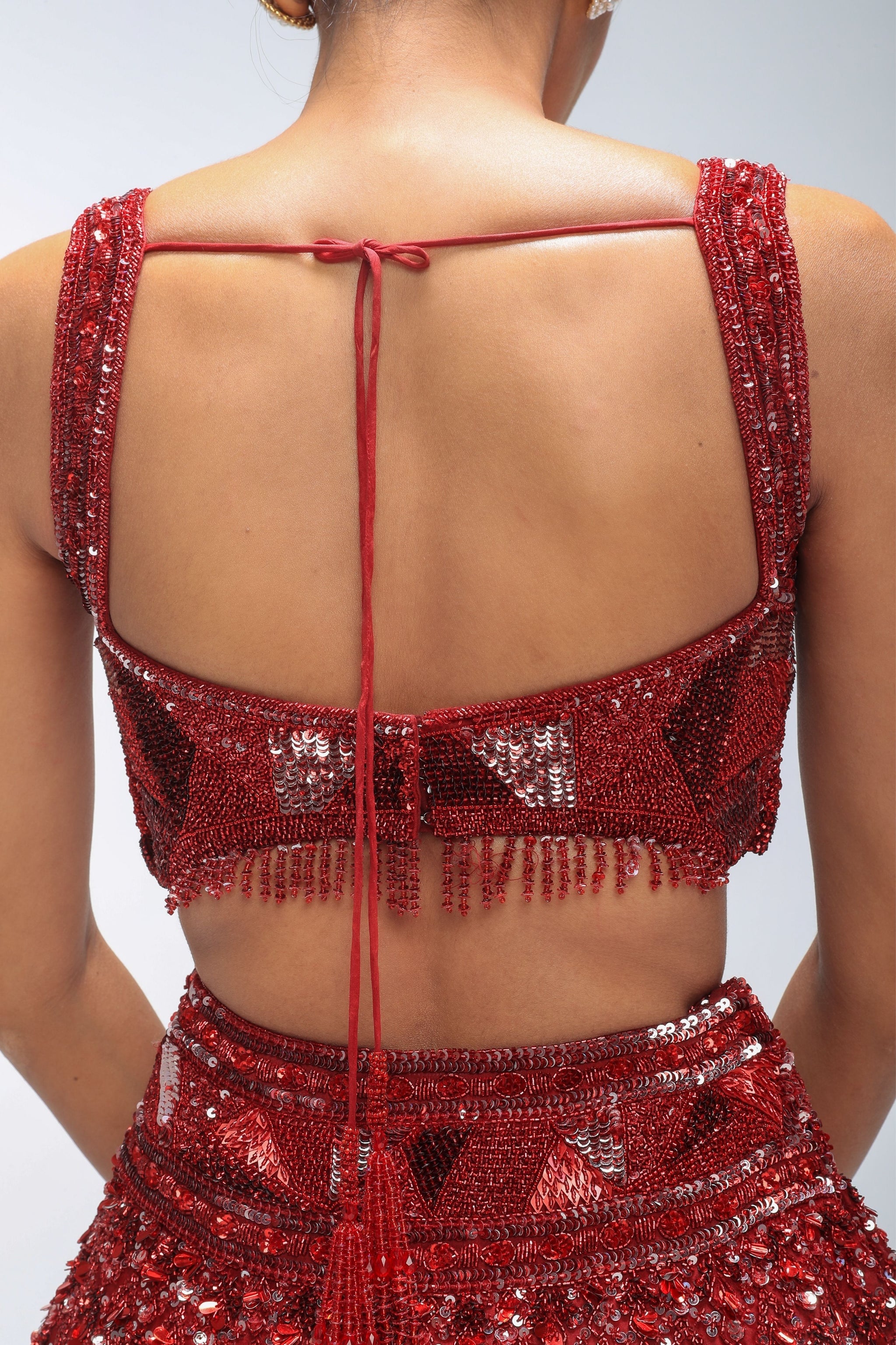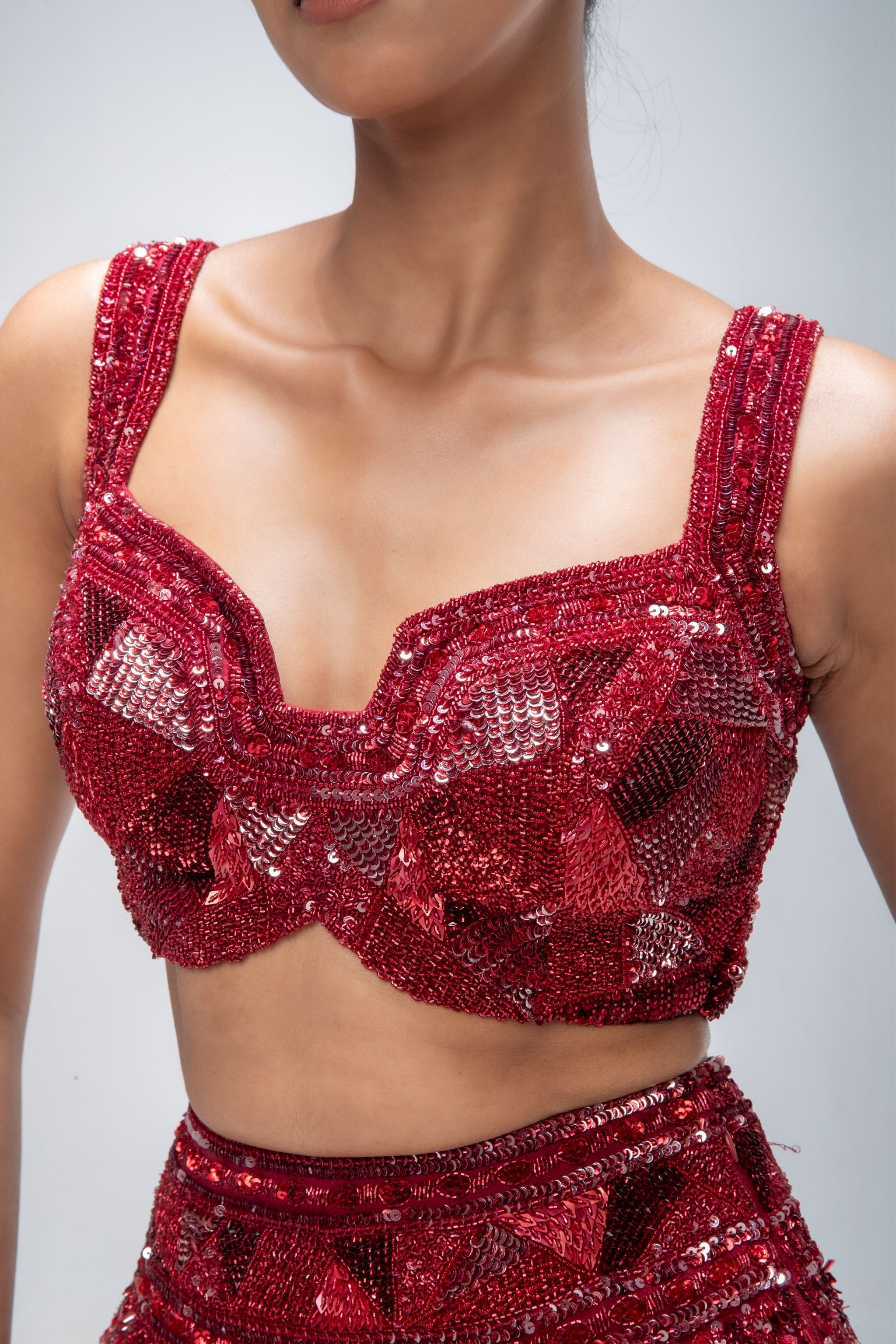 • Ruby red lehenga embellished with sequin work and paired with embroidered blouse and dupatta.